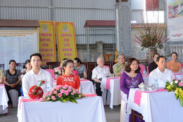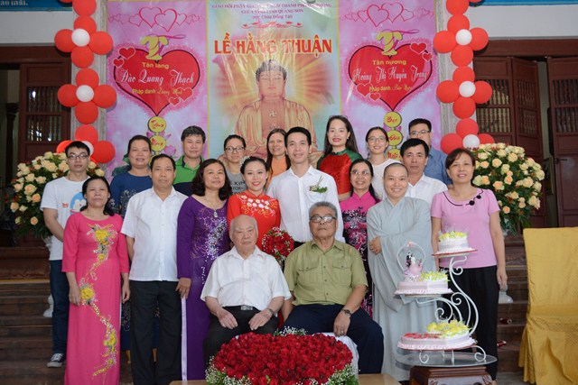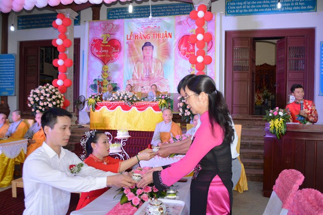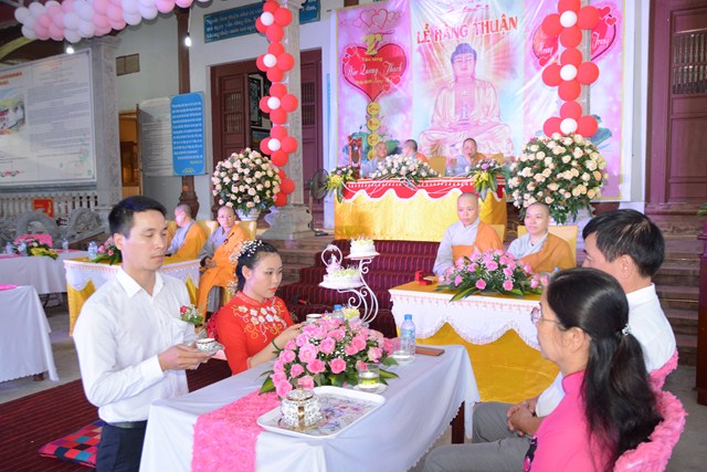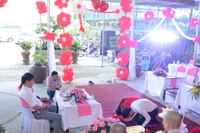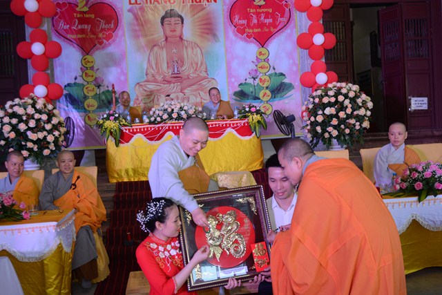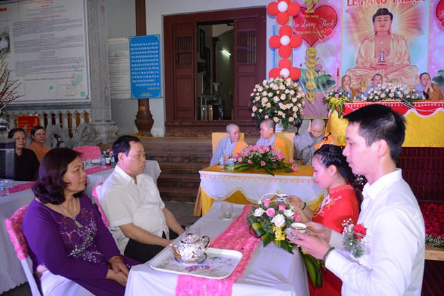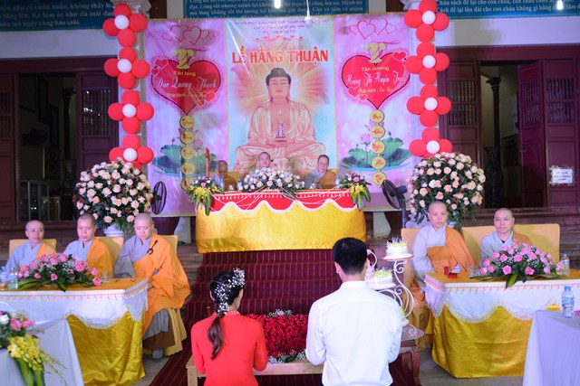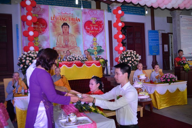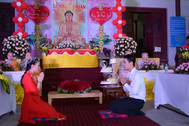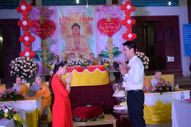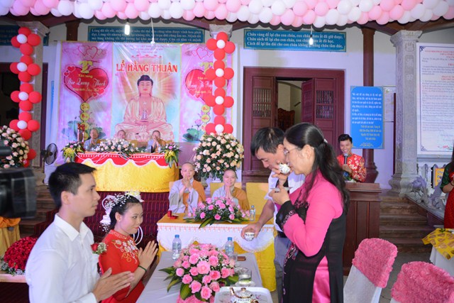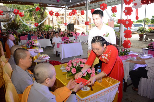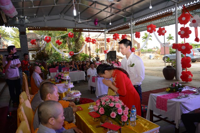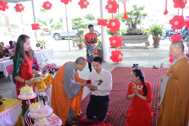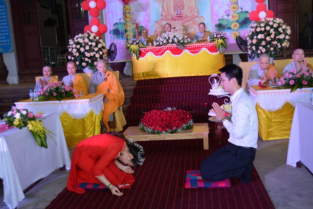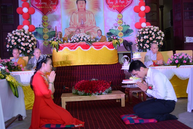 Dưới sự gia hộ của mười phương Chư Phật và sự chứng minh của Chư tôn đức Ni, đôi tân lang, tân nương đã làm lễ tạ ơn Tam Bảo, lễ tri ân công sinh thành dưỡng dục, lễ mời trà để báo đáp thâm ân của hai đấng song thân. Đồng thời, để thể hiện sự kính trọng, bình đẳng, tôn kính lẫn nhau trên tinh thần Từ Bi, Vô Ngã, Vị Tha của Nhà Phật, đôi bạn trẻ đã lễ lạy nhau thông qua nghi lễ bình đẳng.