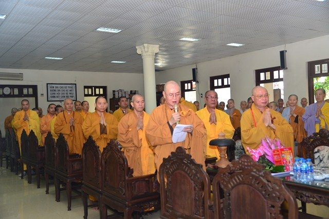 Đúng 7h30’, 128 hành giả an cư tại cơ sở 1 ( Chùa Phổ Chiếu) đã vân tập về chính điện chủa Phổ Chiếu để lễ Phật cầu gia bị. Tiếp đó, chư tôn đức tăng ni đã vân tập tại giảng đường chùa Phổ Chiếu để tham dự lễ khai giảng Vô thượng Pháp Bảo PL. 2563 – DL. 2019. Đại vì chư tôn đức tăng ni thực hiện cấm túc an cư tại hạ trường cơ sở 1, Thượng tọa Thích Nguyên Bình – Chánh Duy Na hạ trường đã lên tác bạch cầu pháp.