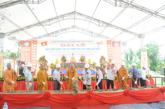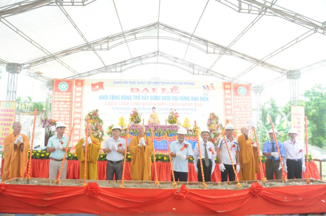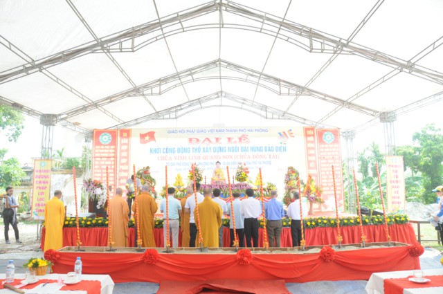 Trước khi kết thúc buổi lễ, chư tôn đức thường trực BTS GHPGVN thành phố Hải Phòng cùng các cấp chính quyền địa phương đã làm lễ dâng hương bạch Phật, cầu nguyện Quốc thái dân an và xúc những xẻng cát đầu tiên động thổ xây dựng chùa Vĩnh Linh Quang Sơn ( Chùa Đồng Tải) trong niềm hoan hỷ của đông đảo Chư tôn đức Tăng Ni, quý vị đại biểu, quý quan khách, đồng bào Phật tử và nhân dân địa phương.
