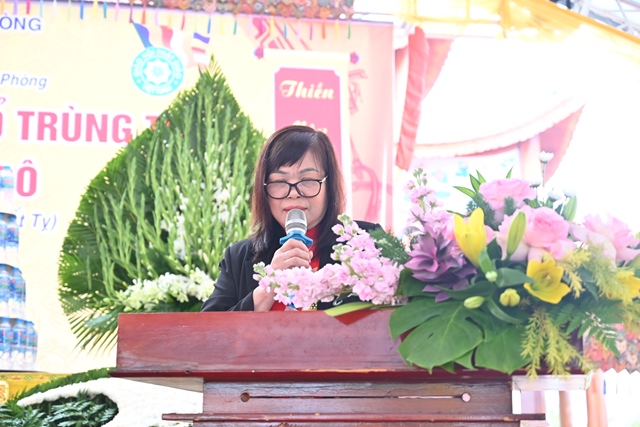 Bà Vũ Thị Thủy – Trưởng thôn Câu Trung phát biểu khai mạc và báo cáo dự kiến quá trình kiến thiết, xây dựng chùa Ngô