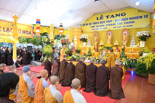 Tại buổi lễ, Sư cô Thích Diệu Hướng – Ủy viên BTS GHPGVN thành phố Hải Phòng đại diện môn đồ pháp quyến, sơn môn pháp phái đã tác bạch cung thỉnh chư Tôn đức quang lâm đàn tràng, cử hành nghi lễ niêm hương bạch Phật và nhất tâm trì niệm chú Đại bi, thập chú, Bát – nhã tâm kinh, tụng kinh A Di Đà cầu nguyện Giác linh của cố Ni sư Thích Diệu Thụy được thượng phẩm, thượng sinh, cao đăng Phật quốc.