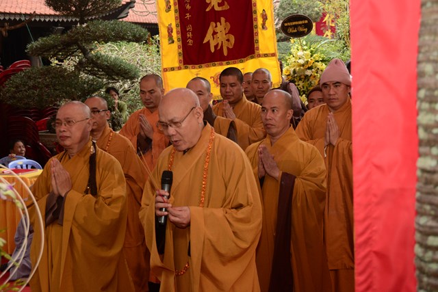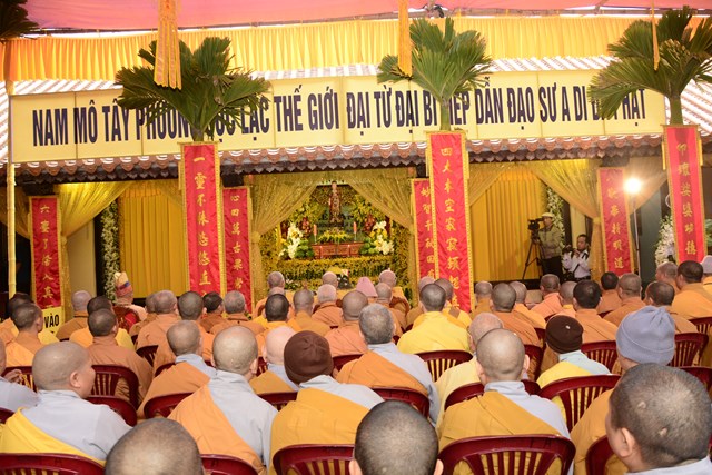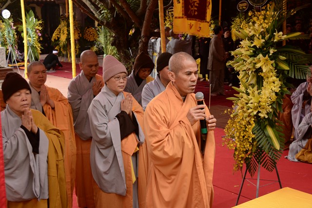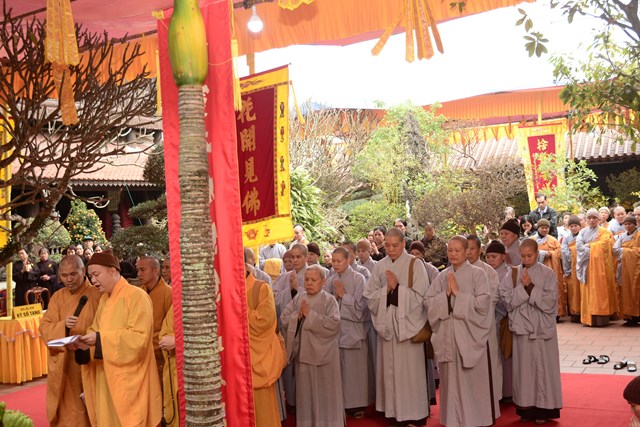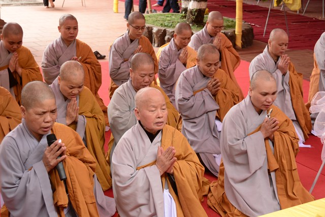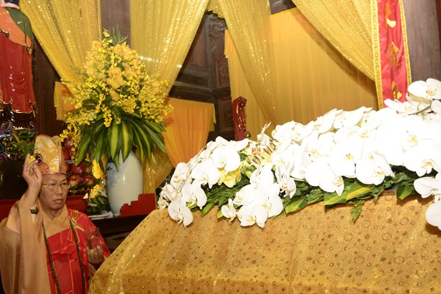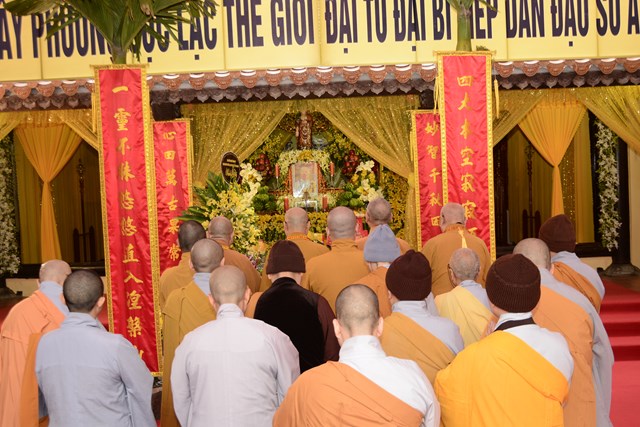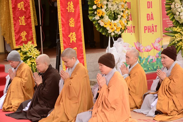 Trước khi chính thức cung thỉnh nhục thân Ni trưởng Thích Diệu Tâm nhập kim quan, Chư tôn đức BTS GHPGVN thành phố Hải Phòng đã tụng kinh A Di Đà cầu nguyện cho giác linh cố Ni trưởng được thượng phẩm, thượng sinh, cao đăng Phật Quốc.