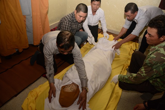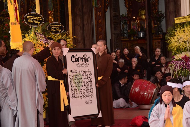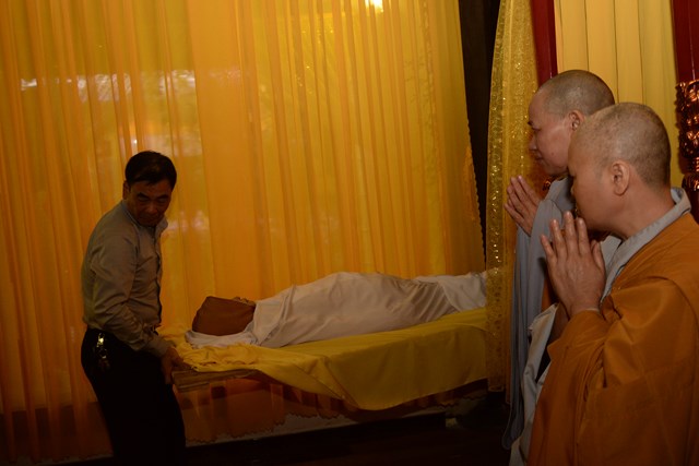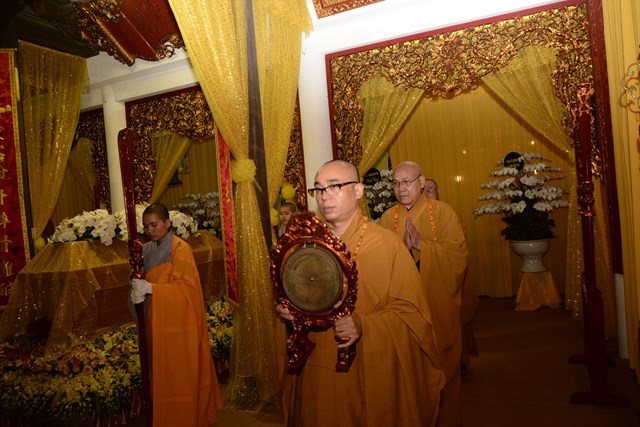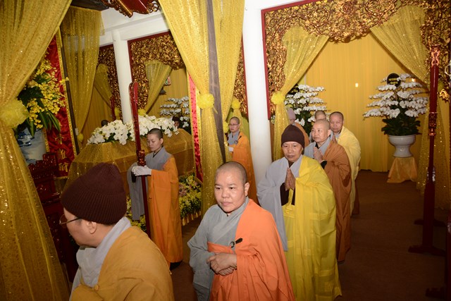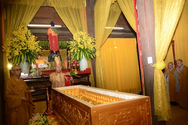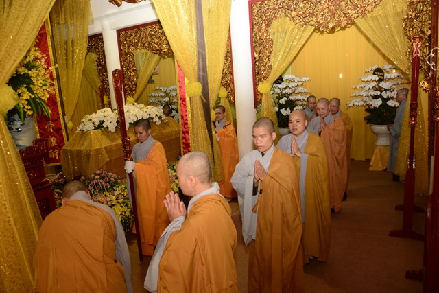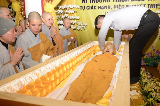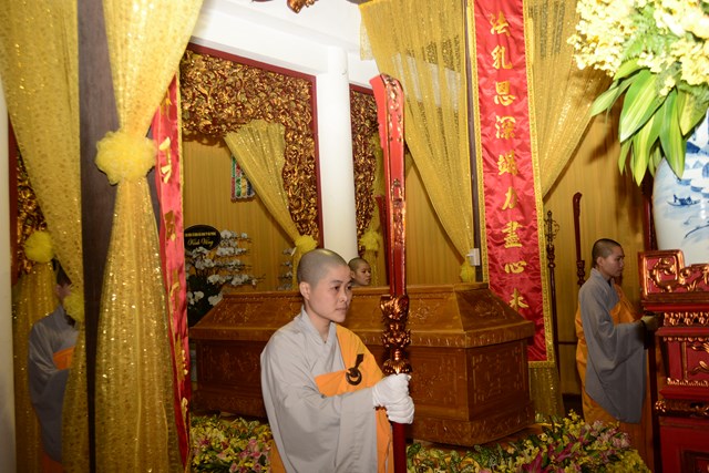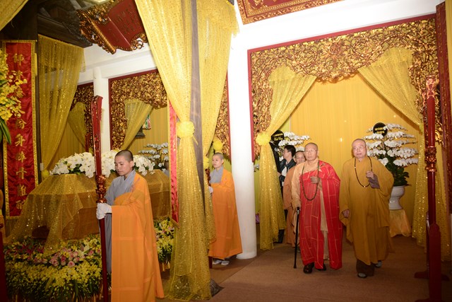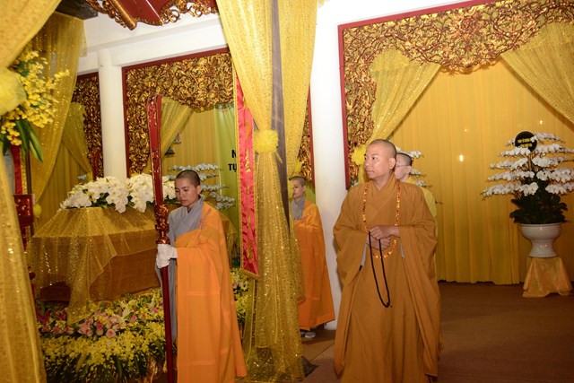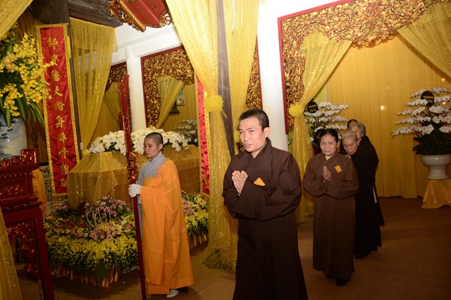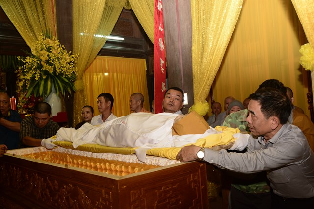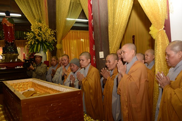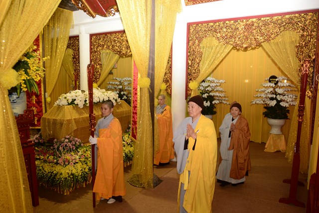 Sau khi Hòa Thượng sám chủ Thích Đồng Điển và chư Tăng cử hành nghi lễ gia trì kim quan, các pháp tử, pháp tôn, môn đồ pháp quyến, thân quyến của cố Ni trưởng tân viên tịch đã cung thỉnh nhục thân của Ngài từ thiền thất đến nơi an trí kim quan tại Tổ Đường để nhập kim quan trong niềm tiếc thương vô hạn, toàn thể đại chúng đã không khỏi xúc động, bùi ngùi khi chiêm bái nhục thân của cố ni trưởng lần cuối, nhiều người đã không cầm được nước mắt trước sự ra đi của Ni trưởng – Một bậc thạch trụ khả kính của GHPGVN thành phố Hải Phòng.