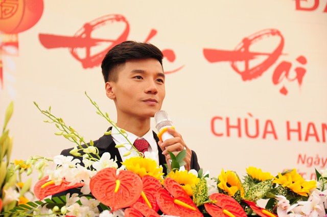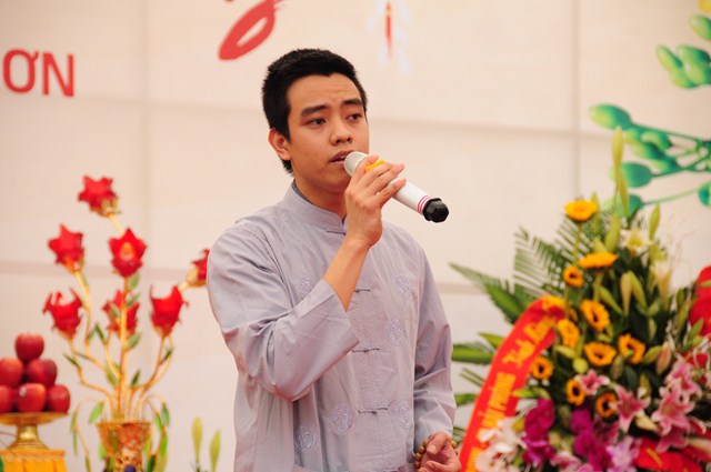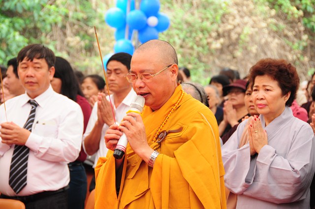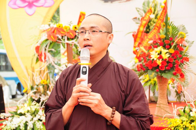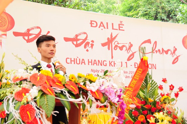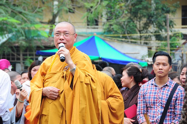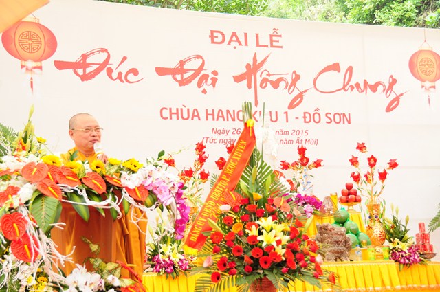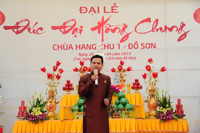 Sau nghi thức niệm Phật cầu gia hộ, chào đạo kỳ, Quốc kỳ, một phút tưởng niệm Chư lịch đại tổ sư đã viên tịch qua các thời kỳ, TT. Thích Thanh Giác – Trưởng Ban tổ chức đại lễ, trụ trì Chùa Hang đã lên cung tuyên diễn văn khai mạc Đại lễ đúc Đại hồng chung, chùa Hang – Đồ Sơn.