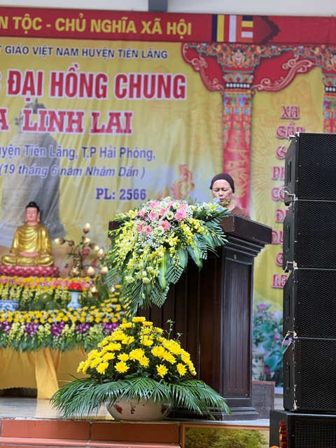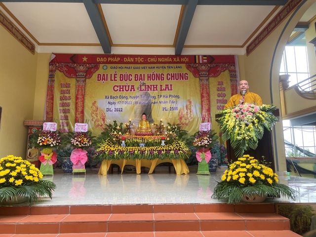 Tại buổi lễ, Thượng tọa Thích Quảng Minh – Trưởng Ban trị sự GHPGVN huyện Tiên Lãng đã chia sẻ về ý nghĩa của chuông chùa và công đức của việc đúc Đại Hồng Chung. Theo đó, hình ảnh ngôi chùa, âm thanh của tiếng chuông đã trở thành biểu tượng tâm linh của mỗi người dân nước Việt. Nét đẹp ấy khắc sâu trong tâm khảm của chúng ta, cho dù đi đâu, hay ở bất cứ phương trời nào, thì hình ảnh và âm ba ấy luôn nhắc nhở, thôi thúc chúng ta nhớ về nguồn cội của chính mình. Không những thế, biểu tượng ấy còn là liều thuốc thần dược, xoa dịu và xoá tan bao nỗi khổ đau nhọc nhằn mà cuộc sống xô bồ, vội vã, ganh tỵ, bon chen của đời thường đầy cạm bẫy này đem lại. Khi hồi chuông gióng lên, chấn động sâu trong tâm thức của con người, bao trần cấu, não phiền đều rơi rụng, thức tỉnh lòng người trở về với thực tại, một thực tại mầu nhiệm và an nhiên của tâm hồn. Qua đó, chúng ta thấy được rằng, tiếng chuông đóng một vai trò rất quan trọng trong đời sống tâm linh của mỗi người.