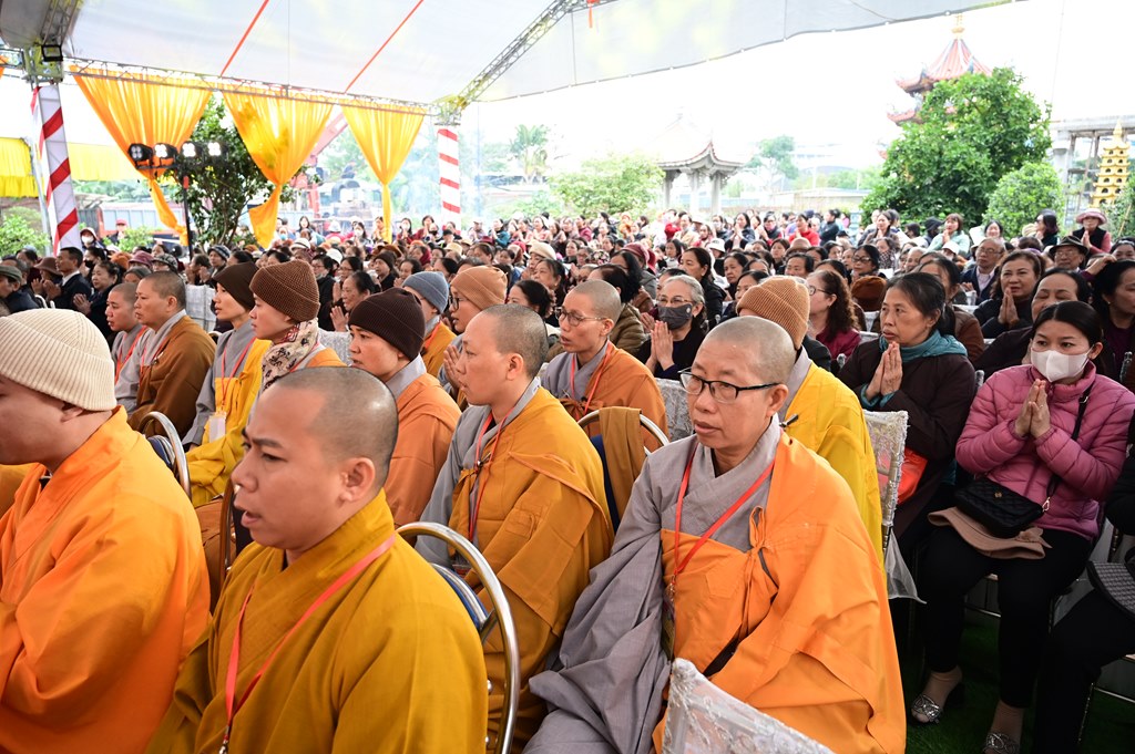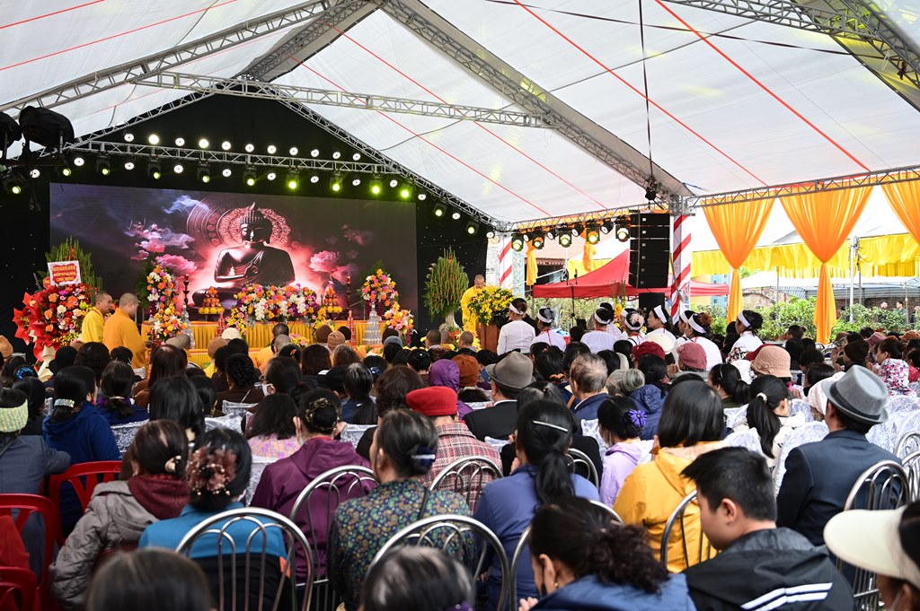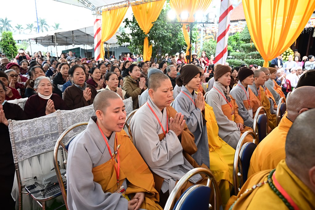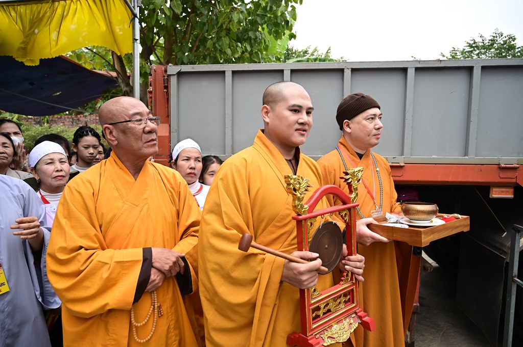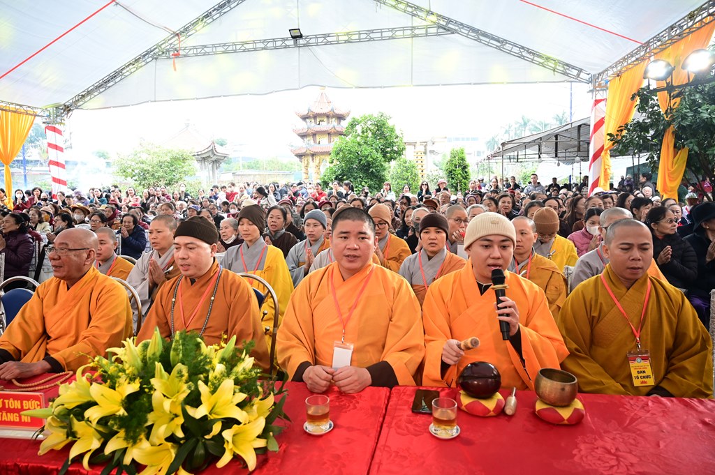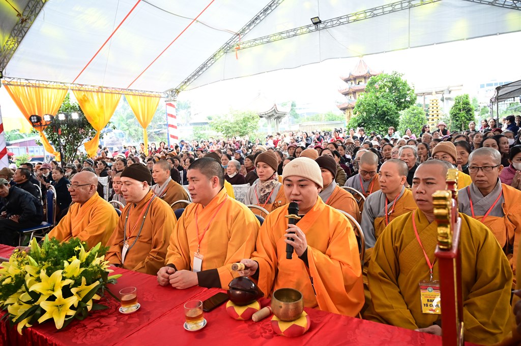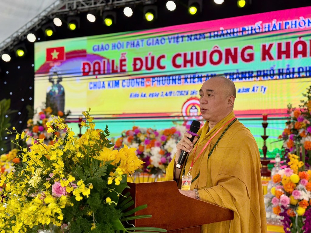 Ban đạo từ và chia sẻ tại buổi lễ, Thượng tọa Thích Tục Nhân đã nói lên nguồn gốc của đại hồng chung (hay còn gọi là chuông lớn), chuông là một pháp khí quan trọng, được sử dụng từ rất sớm, có tác dụng thức tỉnh, khai mở trí tuệ cho hành giả trên con đường giác ngộ giải thoát. Khi Đức Thế Tôn còn tại thế, Ngài đã sử dụng tiếng chuông như một phương tiện để đánh thức tâm thức của các đệ tử. Trong nhiều kinh điển, khi thuyết giảng giáo pháp, Đức Phật thường thỉnh chuông để giúp đệ tử cảm nhận giáo pháp qua tính nghe, từ đó dung nhập sâu vào Phật trí. Đại hồng chung còn được gọi là chuông lớn hay chuông U Minh, thường được đánh vào đầu hôm và cuối đêm. Tiếng chuông đầu hôm nhắc nhở con người về lẽ vô thường của kiếp sống; tiếng chuông cuối đêm sách tấn hành giả tinh tấn tu tập, đoạn trừ phiền não, thanh lọc tham – sân – si. Chuông được đánh 108 tiếng, tượng trưng cho 108 phiền não của chúng sinh; khi tiếng chuông vang lên, các phiền não ấy được chuyển hóa, trí tuệ phát sinh, căn lành tăng trưởng, hướng đến sự giải thoát trong tương lai.