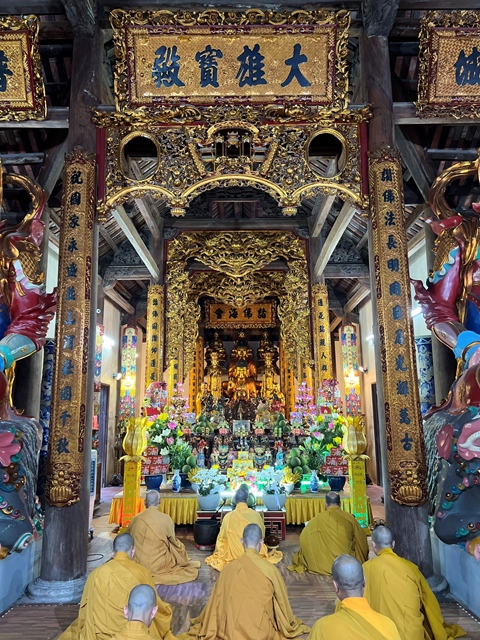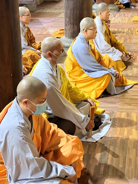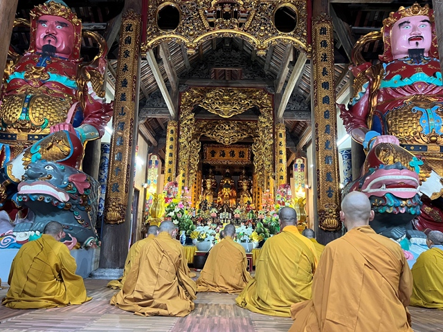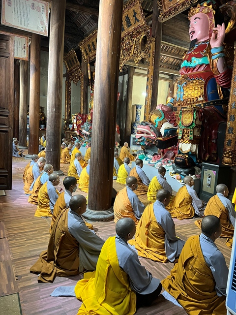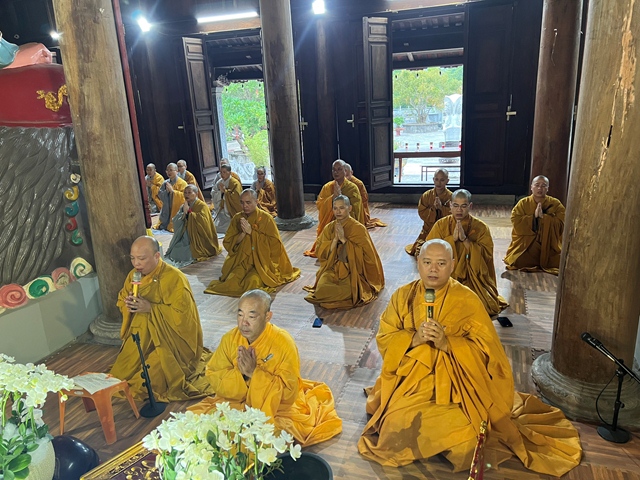 Chư tôn đức thực hiện cấm túc an cư kiết hạ lễ Phật cầu gia hộ tại chính điện Tổ đình Thắng Phúc.