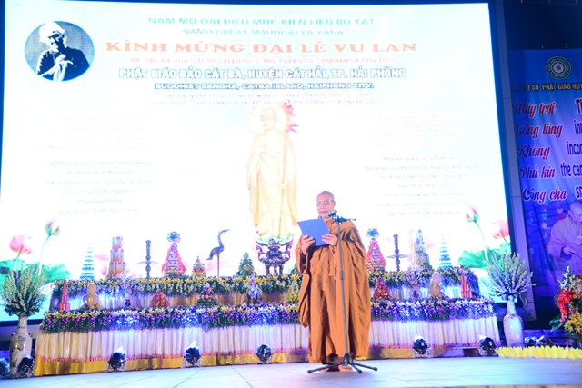 Thay mặt cho các Phật tử có mặt tại buổi lễ, một Phật tử đang tu học tại chùa Linh Quang – Thị trấn Cát Bà đã lên tuyên đọc ý nghĩa Vu Lan: “ Vu Lan bồn là ngày lễ báo hiếu vô cùng cao đẹp của Phật giáo nói riêng và là ngày lễ hội báo hiếu nói chung của mọi người con hiếu trên thế gian này. Lễ Vu Lan mang một ý nghĩa thật thiêng liêng cao cả, giúp cho con cái nghĩ nhớ đến công ơn cha mẹ, khơi dậy trong lòng họ một tinh thần báo hiếu đáng quý, đáng trân trọng. Người con Phật nhận thức sâu sắc lời Phật, mùa Vu Lan về càng nỗ lực tinh tấn thực hành hạnh hiếu để báo đáp thâm ân của cha mẹ. Thờ kính cha mẹ đã trở thành một đạo lý sống của dân tộc Việt Nam, đồng thời cũng là đạo lý sống của hàng Phật tử khi khẳng định đạo Phật là đạo hiếu.”