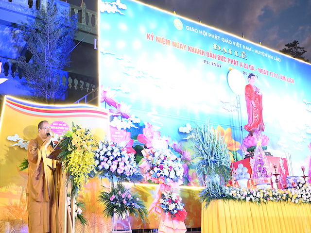 Tiếp đó, Đại đức Thích Bản Điền – Trưởng BTS GHPGVN huyện An Lão, đã lên cung tuyên Lược sử Đức Phật A Di Đà và ý nghĩa của pháp môn tu niệm Phật. Đối với các hành giả tu pháp môn niệm Phật, cần phải lấy Tín – Nguyện – Hành để làm tư lương cho lộ trình vãng sinh về thế giới Tây Phương Cực Lạc. Đức Phật A-Di-Đà là giáo chủ của cõi Tây phương Cực Lạc, là vị Phật đã phát ra 48 lời thệ nguyện rộng lớn để tiếp dẫn, cứu độ chúng sinh. Những lời thệ nguyện của Ngài bao trùm khắp pháp giới, dung chứa chúng sinh khắp ba cõi, bốn loài. Với tình thương không hạn lượng và trí tuệ vô biên, cõi Tây phương của Ngài đã trở thành Lạc quốc cho chúng sinh quay về nương tựa, tu tập giải thoát.