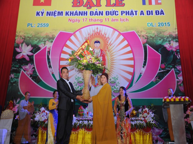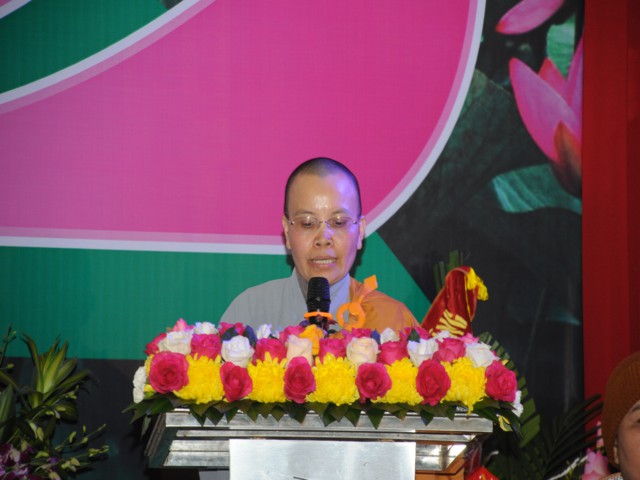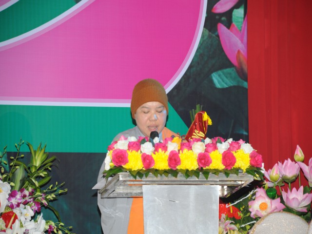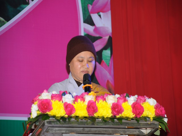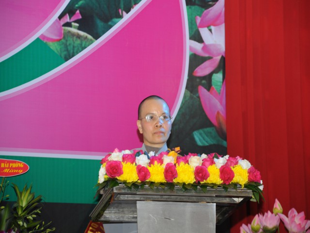 Sau nghi thức niệm Phật cầu gia hộ, một phút nhập từ bi quán tưởng niệm chư tôn đức hữu công của GHPGVN, tưởng niệm các anh hùng liệt sỹ đã hy sinh cho độc lập chủ quyền của Đất nước, Ni Sư Thích Tâm Chính – Trưởng Ban trị sự GHPGVN quận Hải An đã lên tuyên đọc Diễn văn khai mạc Lễ hội hoa đăng kính mừng Khánh đản Đức Phật A Di Đà PL. 2559, DL. 2015.