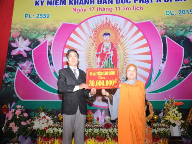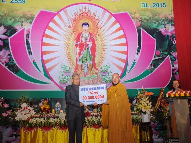 Nhân dịp này, Ban trị sự GHPGVN quận Hải An đã trao tặng Hội nạn nhân chất độc màu da cam và hội bảo trợ người tàn tật, trẻ mồ côi Tp. Hải Phòng với tổng số tiền là 60 triệu đồng. Đây là hành động đẹp của Chư tôn đức Tăng Ni GHPGVN quận Hải An dâng lên đức từ phụ A Di Đà nhân ngày đản sinh của Ngài và cũng nói lên tinh thần từ bi, tương thân tương ái của đạo Phật dựa trên phương châm của GHPGVN đó là : “Phật giáo luôn đồng hành cùng Dân tộc”.