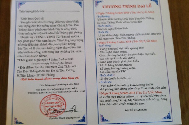 Sáng nay, 6/5/2015 ( tức ngày 18/3/Ất Mùi), Đại đức Thích Quảng Minh – Trưởng BTS GHPGVN huyện Tiên Lãng cùng đoàn đại biểu Quốc hội thành phố Hải Phòng do ông Chuẩn đô đốc Nguyễn Viết Nhiên làm trưởng đoàn đã làm lễ dâng hương tại Đền thờ cố chủ tịch nước Tôn Đức Thắng.
