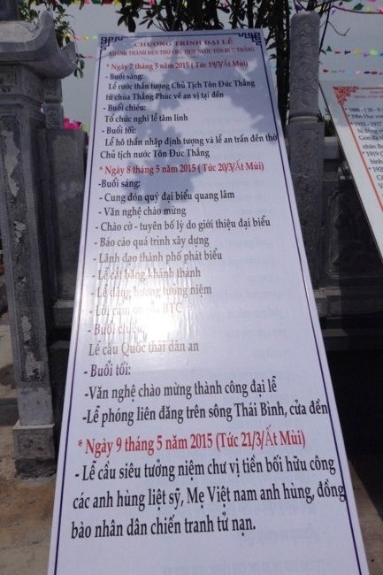8h00: Lễ hành chính, cắt băng khánh thành và dâng hương tưởng niệm tại Đền thờ cố chủ tịch nước Tôn Đức Thắng.