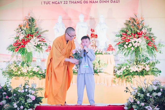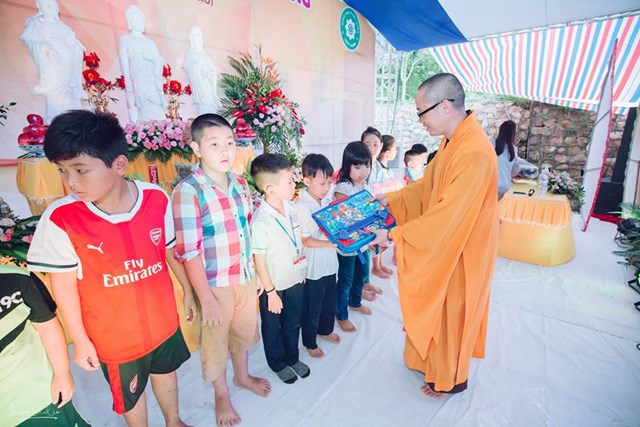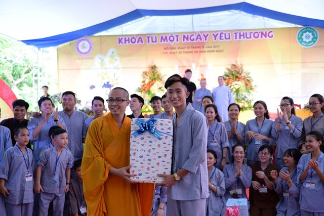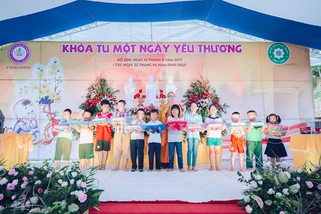Nhân dịp này, đại diện cho BTC khóa tu, Đại đức Thích Giác Hiệu đã lên trao quà cho các em học sinh nghèo có hoàn cảnh khó khăn, đạt thành tích cao trong năm học vừa qua đang học tập, sinh hoạt tại quận Đồ Sơn, thành phố Hải Phòng, những món quà tuy nhỏ nhưng rất ý nghĩa để đúng vào dịp năm học mới này, các em sẽ có sách vở, cặp sách, đồ dùng học tập để tới trường, giúp các em và gia đình vơi bớt khó khăn, mặc cảm trong cuộc sống.