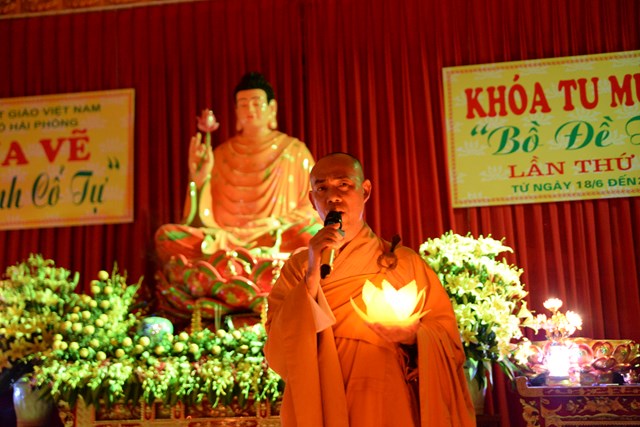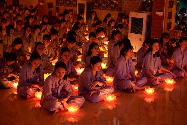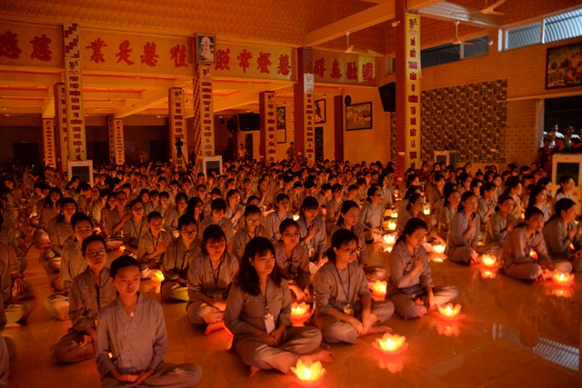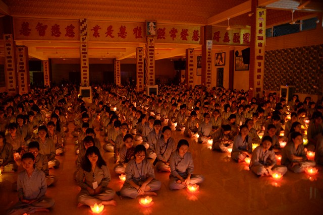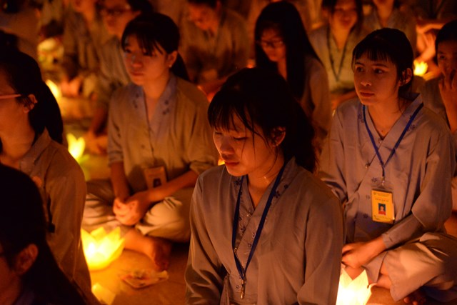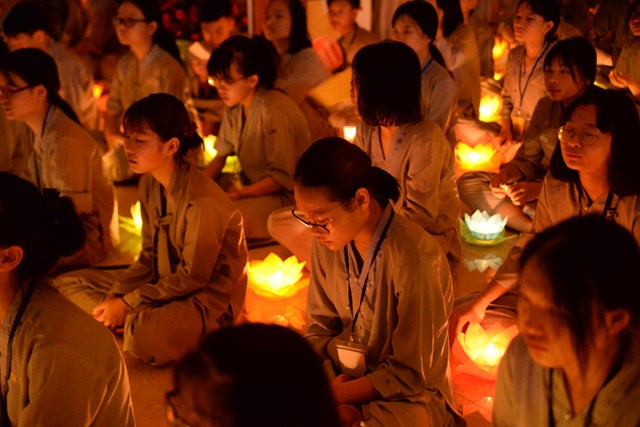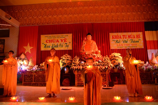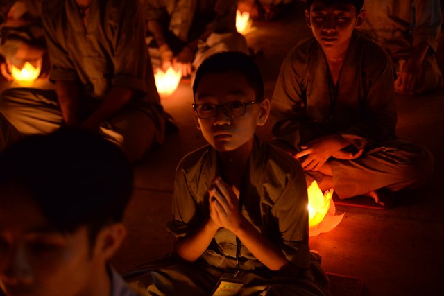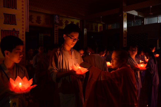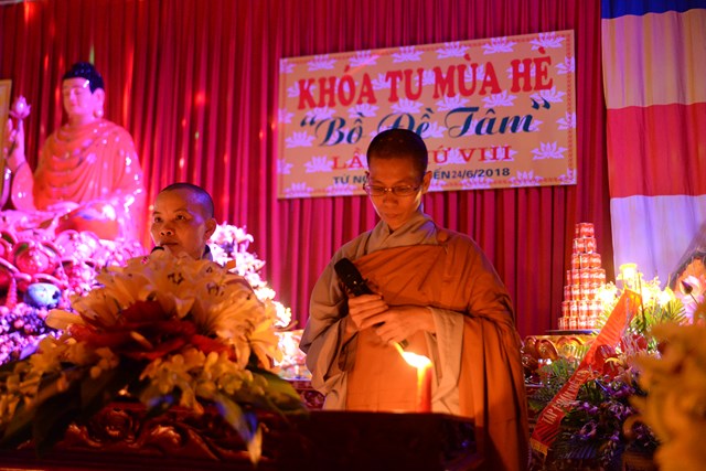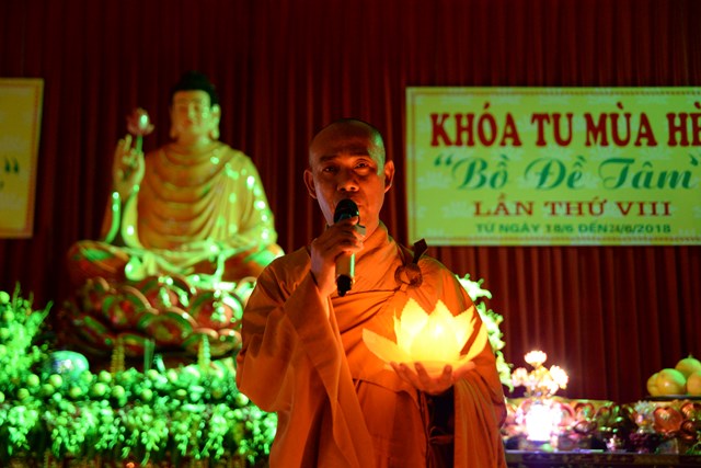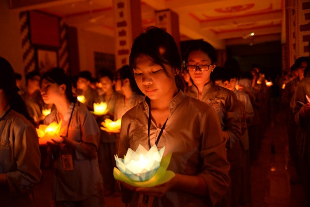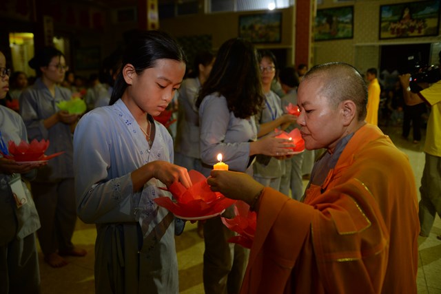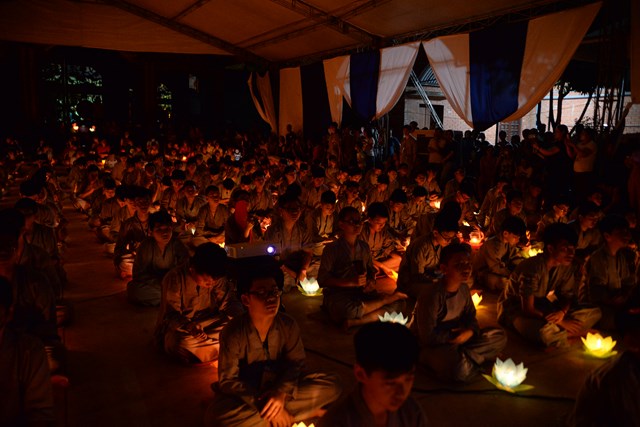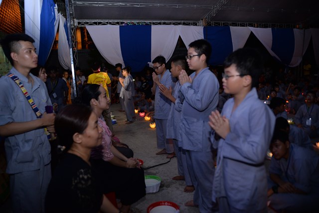 Thời khắc linh thiêng nhất của buổi lễ đã đến khi chư tôn đức đón nhận ánh sáng từ bàn Phật, ánh sáng của Từ Bi và Trí Tuệ để truyền sang cho hơn 800 khóa sinh tham dự khóa tu mùa hè năm nay. Từng ngọn nến đã được thắp sáng khắp giảng đường, một không gian lung linh, huyền ảo dần dần được hiện ra trước mắt. Trước mặt các em là những ngọn nến của tình thương và sự hiểu biết. Cầm ngọn nến trên tay, các em chắc hẳn sẽ tự hứa với lòng mình là từ nay sẽ không để cho cha mẹ phải buồn, sẽ cố gắng học tập để không phụ lòng quý sư thầy, sư cô đã dạy dỗ các em trong những ngày vừa qua cũng như không phụ lòng cha mẹ đã không quản ngại gian nan, vất vả, nuôi dạy các em để các em có được thân hình, vóc dáng như ngày hôm nay, rất nhiều giọt nước mắt đã rơi khi các em tự thấy bản thân mình có lỗi với cha mẹ. Ban tổ chức khóa tu cũng hy vọng khi về nhà các em sẽ thay đổi cả cách sống và cách suy nghĩ của mình, trở thành những con người tốt, sống có ích cho gia đình và xã hội.