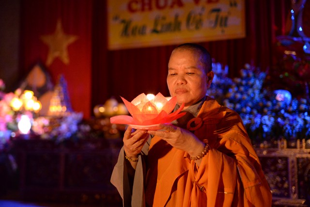 Ni sư Thích Tâm Chính – Trưởng BTC xin ánh sáng từ ban Phật