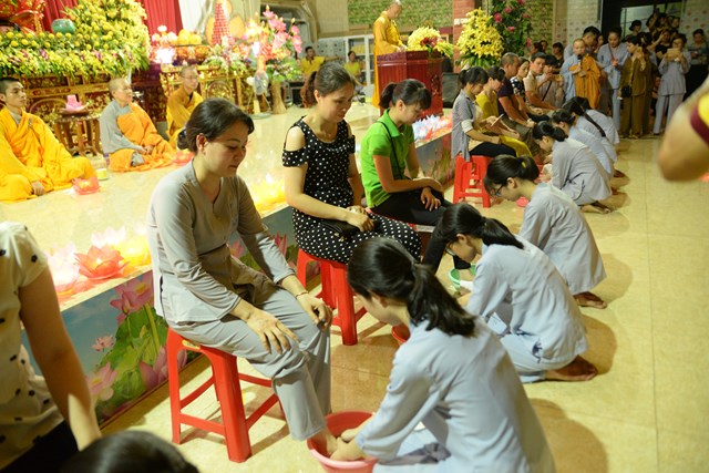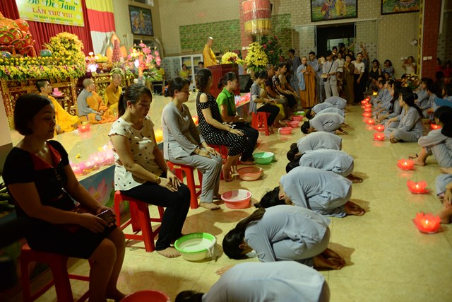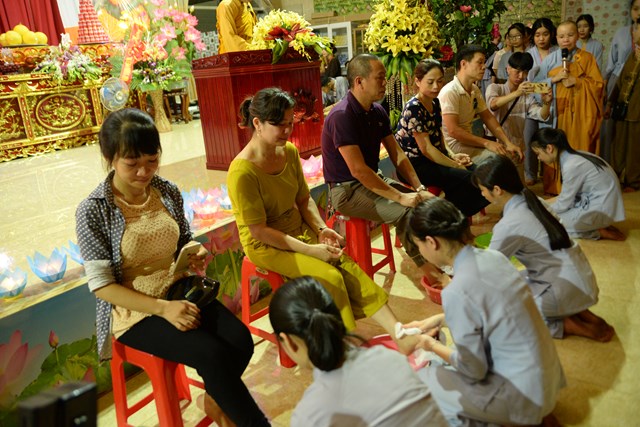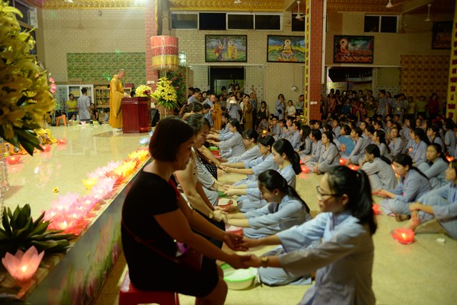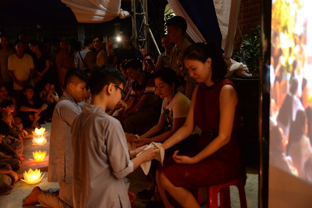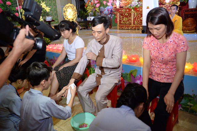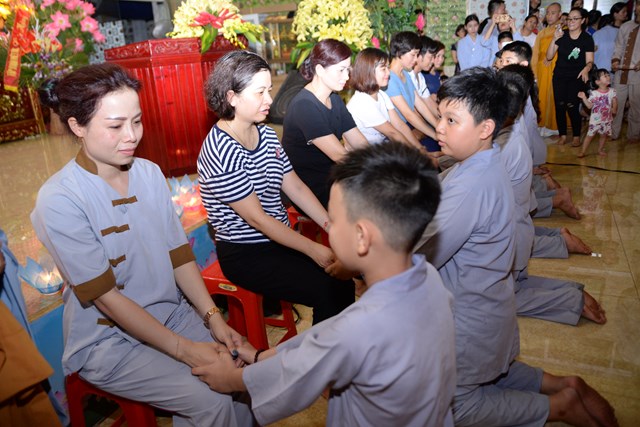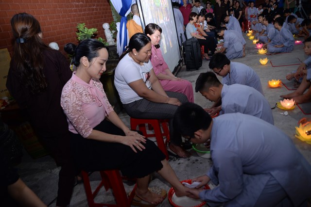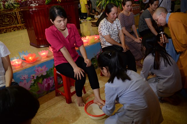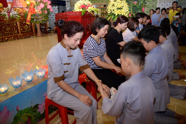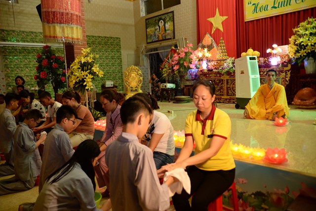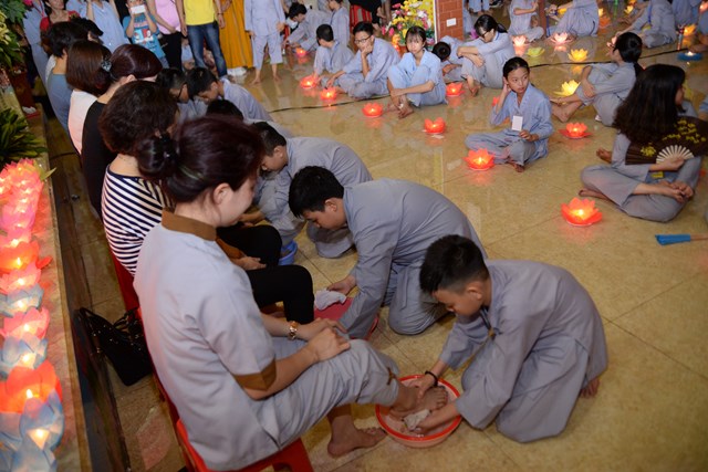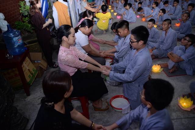 Buổi tối cùng ngày, hơn 800 khóa sinh đã được tham dự buổi lễ thắp nến tri ân và lễ rửa chân tại ơn cha mẹ. Buổi tối hôm nay, đại diện một số vị phụ huynh của các em khóa sinh đã được Ban tổ chức khóa tu mùa hè chùa Vẽ mời tới tham dự buổi lễ. Sau gần 1 tuần các em khóa sinh xa nhà, phụ huynh của các em có lẽ là rất nhớ con của mình và các em khóa sinh cũng sẽ nhớ cha mẹ mình nhiều hơn khi được học những bài học về Đạo Hiếu, về chữ “ Hiếu” qua lời giảng của quý Sư thầy, Sư cô. Và hôm nay, chính các vị phụ huynh đã được những đứa con trực tiếp rửa chân, rửa tay cho mình. Các vị phụ huynh khi tham dự buổi lễ đã cảm nhận được sự thay đổi của con mình, các khóa sinh đã thay đổi hẳn so với những ngày trước khi tham dự khóa tu, những giọt nước mắt đã tuôn rơi vì xúc động trước tình cảm mà con cái dành cho cha mẹ. Đây là một thành công lớn của mỗi khóa tu mùa hè được tổ chức tại chùa Vẽ. Với mong muốn là sau khóa tu, khi các con trở về với gia đình sẽ biết yêu thương cha mẹ mình nhiều hơn.
