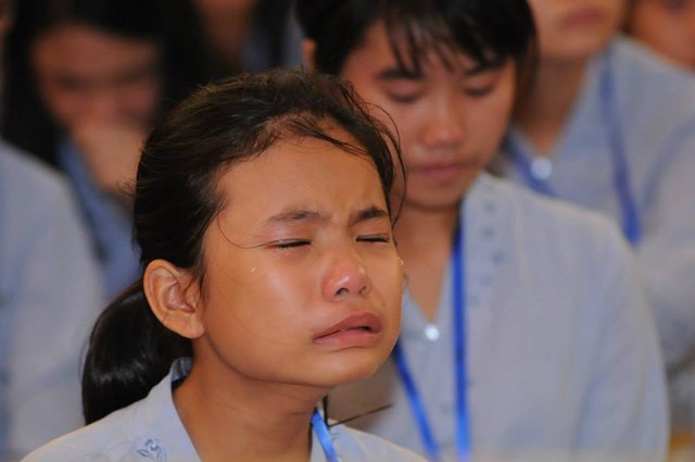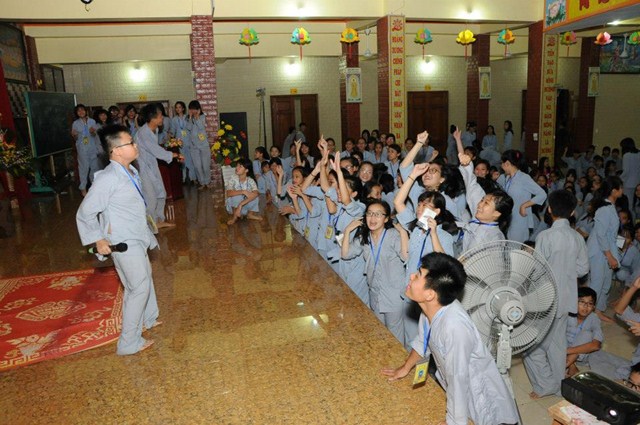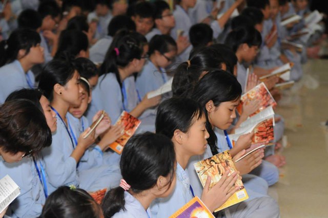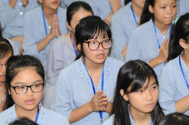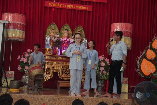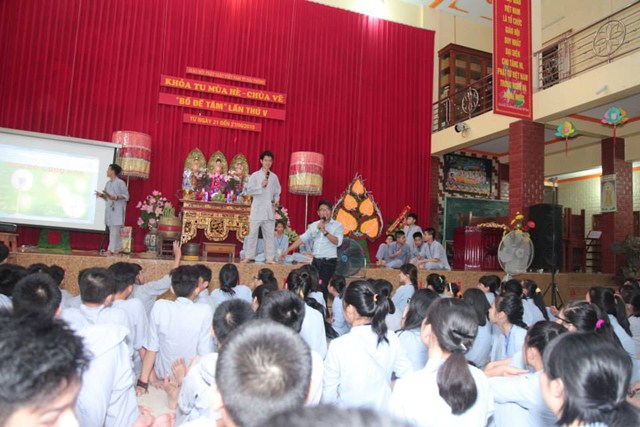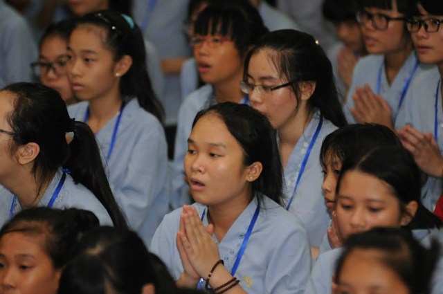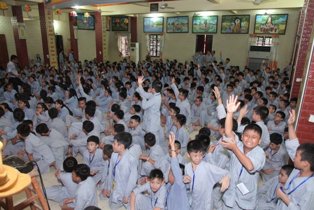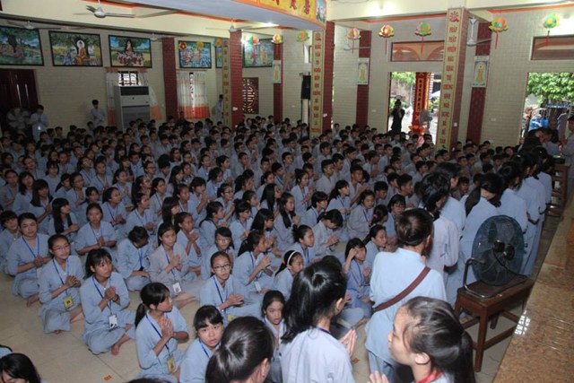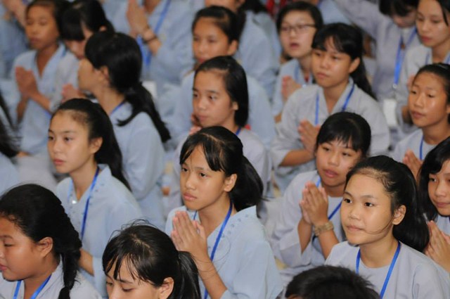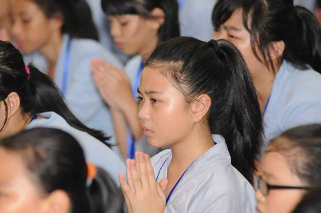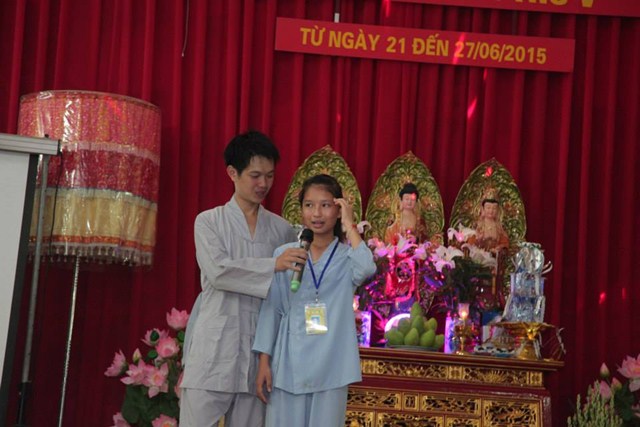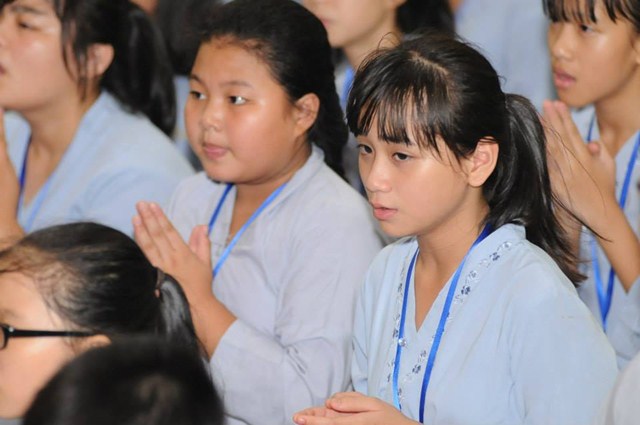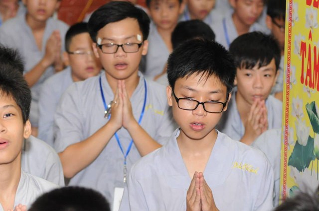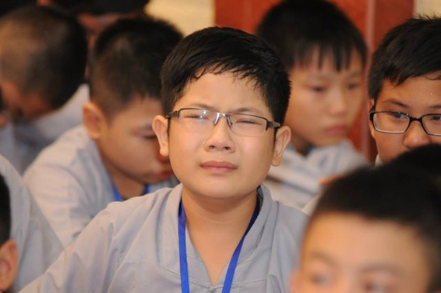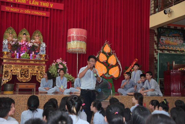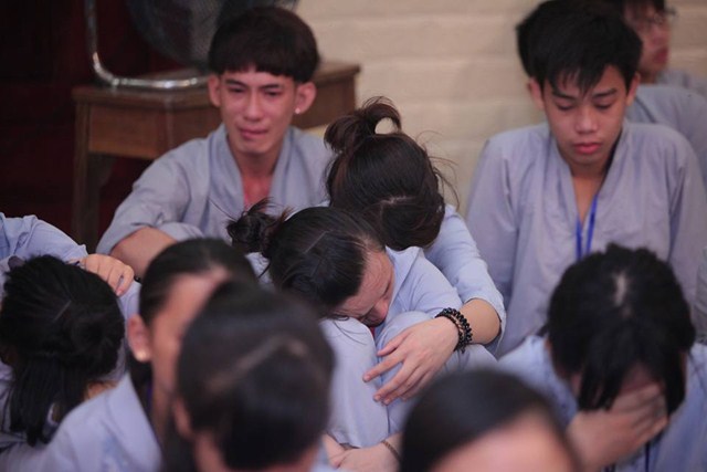 Buổi chiều thì các em lại lắng đọng tâm tư nghe thời pháp thoại ” Tâm Hiếu Của Em” do Đại Đức Thích Trí Định thuyết giảng, qua những câu chuyện về Đạo Hiếu, Tâm Hiếu, các em đã không khỏi xúc động và từng giọt nước mắt bắt đầu rơi, không khí trầm lắng lan tỏa khắp giảng đường khi cả đại chúng lúc này đều nghĩ về 2 đấng sinh thành. Dường như lúc này hình ảnh của ba mẹ các em đang hiển hiện trước mặt các em, những ai đã làm cho ba mẹ buồn thấy mình có lỗi với ba mẹ và trong lòng thầm hứa ngay sau khóa tu này sẽ về để ôm ba mẹ mình và nói lời xin lỗi cha mẹ mà có thể từ trước đến nay các em chưa bao giờ nói được câu nói ” Con xin lỗi ba”, ” Con xin lỗi mẹ”.