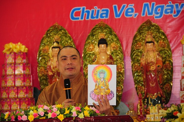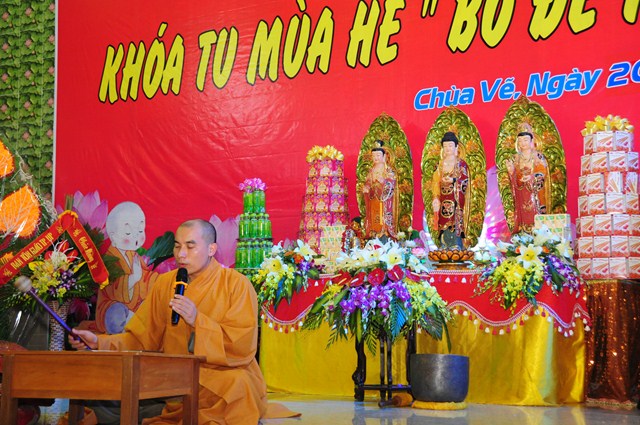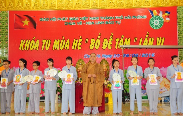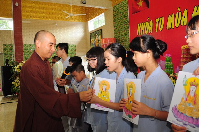 Sáng nay, trước khi phần thưởng cho các bạn khóa sinh đạt kết quả cao tại cuộc thi tô màu cho tranh “Bồ Tát Địa Tạng” diễn ra vào buổi chiều tối ngày hôm qua, các em tu sinh tham dự khóa tu mùa hè ” Bồ Đề Tâm” lần thứ VI tại chùa Vẽ đã được nghe Đại đức Thích Lệ Minh – Ủy viên Ban hoằng pháp TƯ GHPGVN chia sẻ về lịch sử, những tiền thân của Bồ Tát Địa Tạng và công hạnh của Ngài đối với chúng sinh. Ngài Bồ Tát Địa Tạng có một đại thệ nguyện rất lớn là Ngài phát nguyện cứu độ tất cả các chúng sinh ở trong cảnh giới địa ngục. Khi nào trên cuộc đời này không còn chúng sinh nào đau khổ, đều được thành tựu Phật đạo thì Ngài mới yên tâm thọ dụng cảnh giới Niết bàn. Nhưng tựu chung lại, thì hạnh nguyện nổi bật đó không ngoài hai điểm chính là: tinh thần hiếu đạo và tinh thần độ nguyện tất cả khắp pháp giới chúng sinh. Vì vậy, mỗi chúng ta khi niệm danh hiệu Ngài cần phải ghi nhớ những hạnh nguyện độ sinh vĩ đại đó, hãy cùng nhau học, thực hành và cùng phát thệ nguyện: