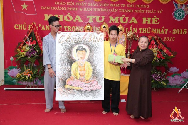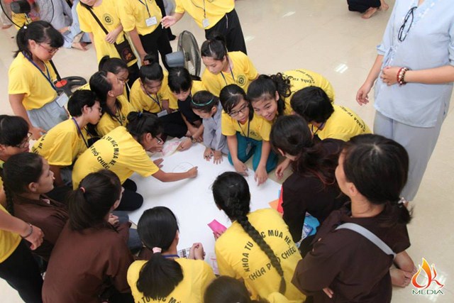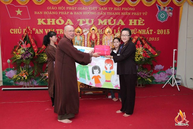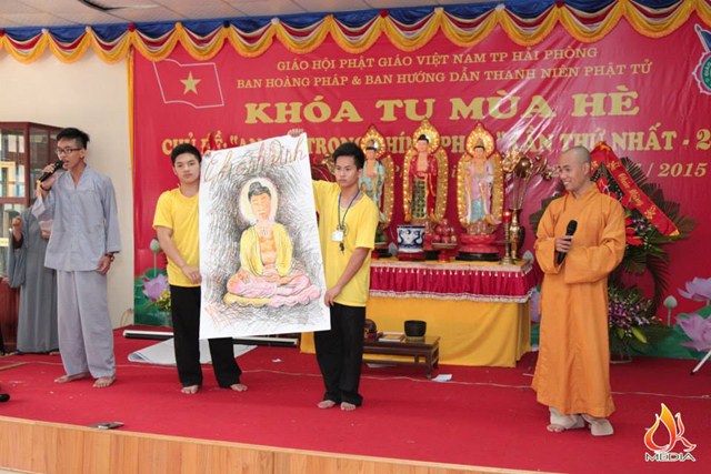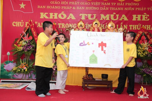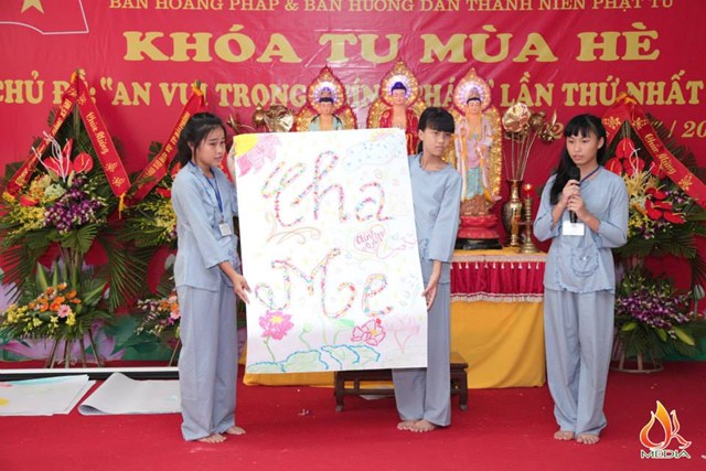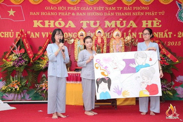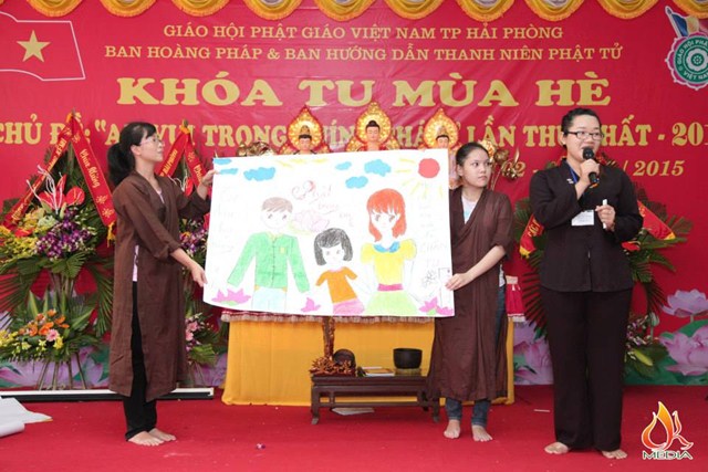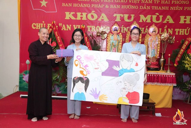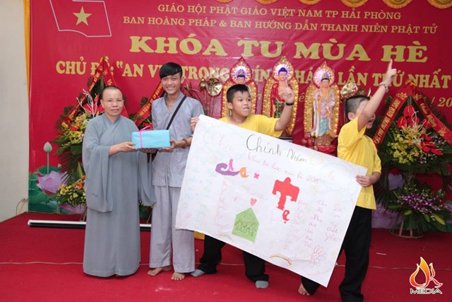 Buổi chiều các em đã được vui chơi thỏa thích, giao lưu với  Sư Cô Thích Diệu Thắm – Ủy viên Ban hướng dẫn thanh thiếu niên Phật tử GHPGVN Tp. Hải Phòng và tụng kinh Vu Lan dưới sự hướng dẫn của các thầy cô trong Ban tổ chức. Khép lại một ngày tu tập ý nghĩa là phần thuyết trình của các em khóa sinh về những bức tranh mà các em đã được thể hiện năng khiếu của mình vào buổi sáng nay. Ban tổ chức cũng đã trao giải cho các Chúng có bức tranh đẹp, ý nghĩa và có phần thuyết trình xuất sắc.