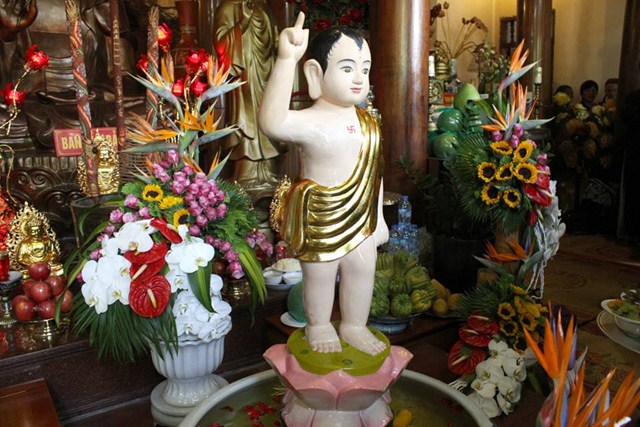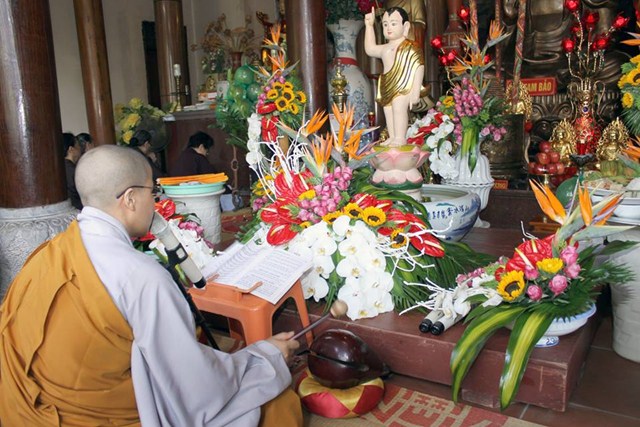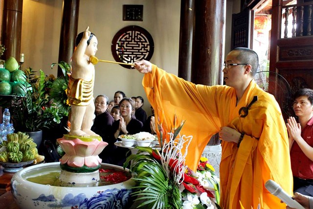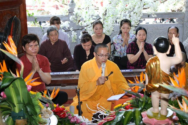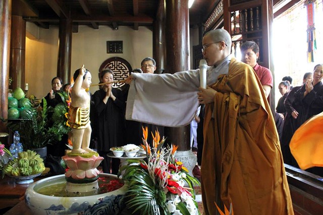 Trước khi cử hành nghi lễ mộc dục đức Phật sơ sinh nhân mùa Phật Đản, Chư tôn đức Tăng Ni đã cùng quý Phật tử tụng một thời kinh Công Đức Tắm Phật trong niềm hoan hỷ vô biên trước sự ra đời của một bậc giác ngộ hoàn toàn, mang lại niềm vui và niềm hạnh phúc cho nhân loại.