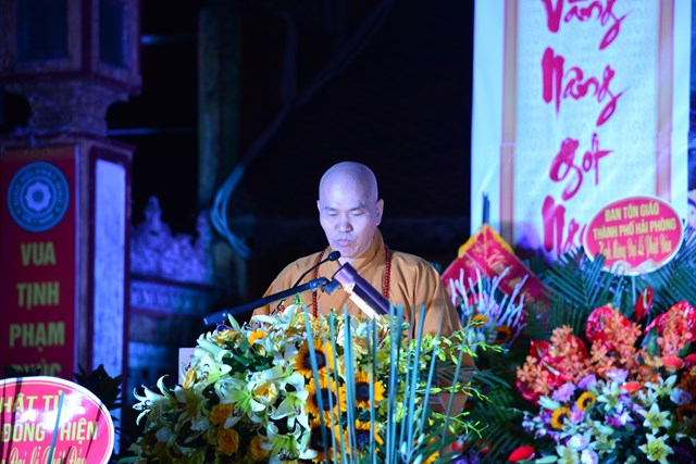Tiếp đó, Đại đức Thích Giác Huy – Trưởng BTS GHPGVN huyện An Dương đã lên tuyên đọc Diễn văn chào mừng Đại lễ Phật đản PL.2563 – DL. 2019 của Hòa thượng Chủ tịch HĐTS TƯ GHPGVN. Trong diễn văn khai mạc, Hòa thượng Thích Thiện Nhơn – Chủ tịch HĐTS TƯ GHPGVN đã nhấn mạnh: “Chủ đề của Đại lễ Vesak Liên Hợp Quốc 2019 là “Cách tiếp cận của Phật giáo về sự lãnh đạo toàn cầu và trách nhiệm cùng chia sẻ vì xã hội bền vững” cho thấy tầm vóc và ý thức trách nhiệm cao cả của Phật giáo trước tình hình biến động của thế giới trên nhiều phương diện đời sống, qua đó cho thấy thái độ tích cực cũng như niềm tin về khả năng góp phần hóa giải những vấn nạn thời đại của Phật giáo ngày càng được khẳng định. Trong chương trình phát triển bền vững toàn cầu của Liên hợp quốc đến năm 2030 nhắm tới đích xóa bỏ nghèo đói, đảm bảo cuộc sống khỏe mạnh và nâng cao phúc lợi, đảm bảo giáo dục chất lượng, bình đẳng giới, thúc đẩy tăng trưởngkinh tế bền vững, tiêu thụ và sản xuất bền vững, ứng phó với biến đổi khí hậu, đảm bảo nguồn tài nguyên và đa dạng sinh học, thúc đẩy xã hội hòa bình, đem lại sức sống mới cho quan hệ đối tác toàn cầu để phát triển bền vững…”