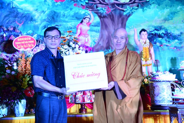 Tại buổi lễ, Hòa thượng Thích Thanh Giác – Phó trưởng Ban thường trực Ban hoằng pháp GHPGVN, phó trưởng BTS GHPGVN thành phố Hải Phòng đã lên cung tuyên Thông điệp Phật đản PL. 2563 – DL. 2019 của trưởng lão Hòa thượng Thích Phổ Tuệ – Đức đệ tam Pháp chủ GHPGVN gửi Tăng Ni, Phật tử trong nước và nước ngoài. Thông điệp nêu rõ: “ Năm nay, hòa trong không khí hân hoan của cộng đồng Phật giáo trên toàn thế giới kỷ niệm ngày Vesak trọng đại, Giáo hội Phật giáo Việt Nam vô cùng vinh dự là nước chủ nhà đăng cai tổ chức Đại lễ Vesak Liên Hiệp Quốc lần thứ 16, PL.2563 – DL. 2019. Đây là cơ hội quý báu để chúng ta cùng nhau tăng trưởng niềm tin vào chân lý giải thoát, phát huy giá trị những di sản mà Đức Thế Tôn đã để lại cho nhân loại chúng ta trong hệ thống tư tưởng giáo lý vô giá về trí tuệ, lòng từ bi, triết lý vô ngã, tinh thần bất bạo động, những giá trị hòa bình và phát triển bền vững”. Toàn thể đại chúng đã đứng lên, trang nghiêm thành kính, lắng đọng tâm tư đón nghe bức thông điệp Phật đản của đức Đệ tam Pháp chủ GHPGVN nhân đại lễ Phật đản.