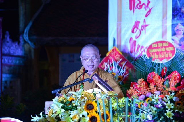 Tại buổi lễ, Hòa thượng Thích Thanh Giác – Phó trưởng Ban thường trực Ban hoằng pháp GHPGVN, phó trưởng BTS GHPGVN thành phố Hải Phòng đã lên cung tuyên Thông điệp Phật đản PL. 2563 – DL. 2019 của trưởng lão Hòa thượng Thích Phổ Tuệ – Đức đệ tam Pháp chủ GHPGVN gửi Tăng Ni, Phật tử trong nước và nước ngoài. Thông điệp nêu rõ: “ Năm nay, hòa trong không khí hân hoan của cộng đồng Phật giáo trên toàn thế giới kỷ niệm ngày Vesak trọng đại, Giáo hội Phật giáo Việt Nam vô cùng vinh dự là nước chủ nhà đăng cai tổ chức Đại lễ Vesak Liên Hiệp Quốc lần thứ 16, PL.2563 – DL. 2019. Đây là cơ hội quý báu để chúng ta cùng nhau tăng trưởng niềm tin vào chân lý giải thoát, phát huy giá trị những di sản mà Đức Thế Tôn đã để lại cho nhân loại chúng ta trong hệ thống tư tưởng giáo lý vô giá về trí tuệ, lòng từ bi, triết lý vô ngã, tinh thần bất bạo động, những giá trị hòa bình và phát triển bền vững”. Toàn thể đại chúng đã đứng lên, trang nghiêm thành kính, lắng đọng tâm tư đón nghe bức thông điệp Phật đản của đức Đệ tam Pháp chủ GHPGVN nhân đại lễ Phật đản.