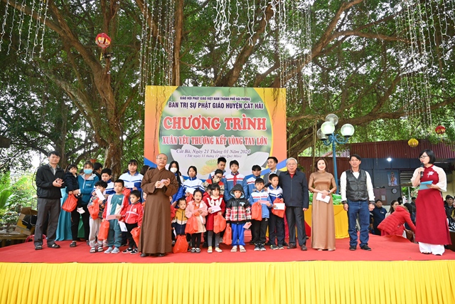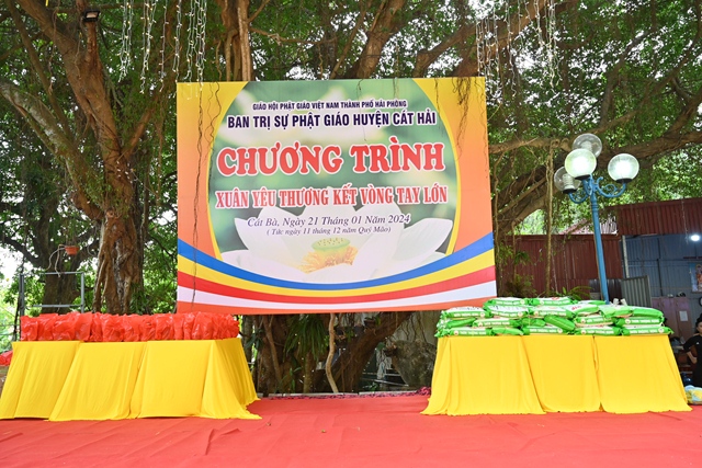 Nhân lễ cung rước, an vị tôn tượng chư Phật, Bồ Tát tại chùa Thiên Ứng, chùa Linh Quang ( huyện Cát Hải) và nhân dịp chuẩn bị đón xuân Giáp Thìn năm 2024, Ban trị sự GHPGVN huyện Cát Hải đã tổ chức chương trình từ thiện mang tên: “ Trao Yêu Thương Kết Vòng Tay Lớn”, trao tặng 280 phần quà cho các gia đình có hoàn cảnh khó khăn và học sinh nghèo vượt khó đang học tập tại các trường trên địa bàn huyện.