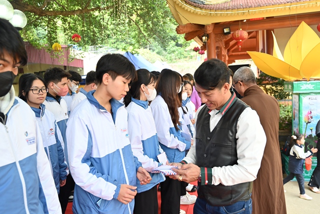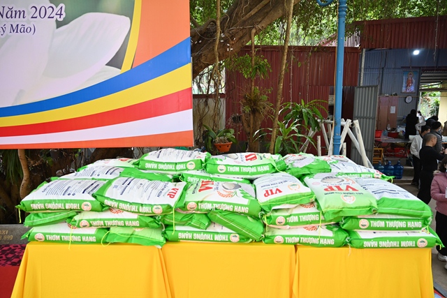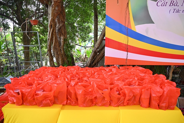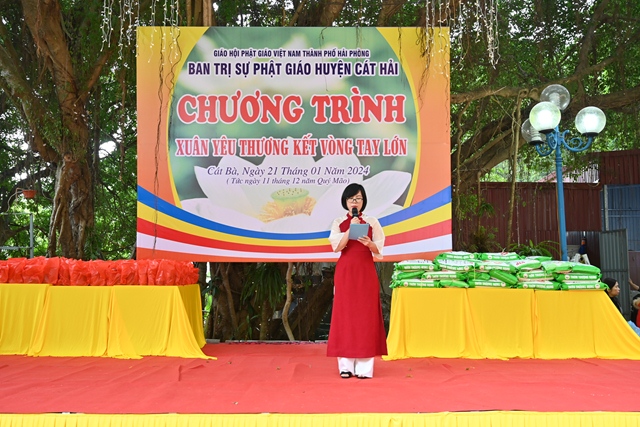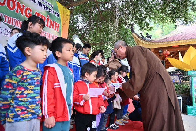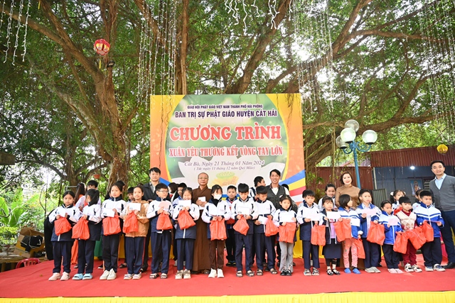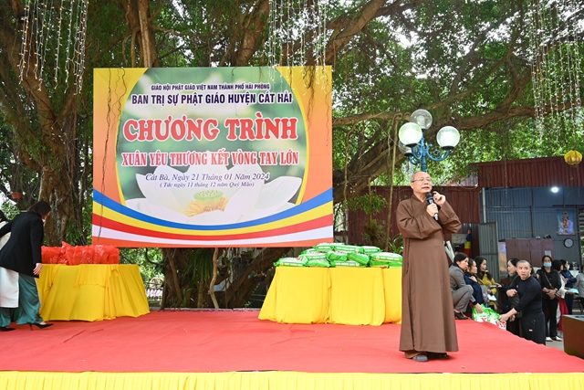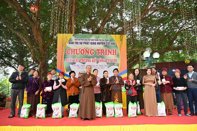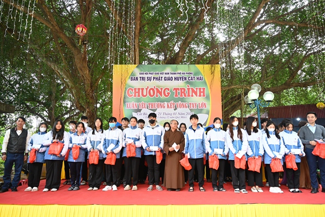Tại buổi phát quà, đại diện Ban trị sự GHPGVN huyện Cát Hải, Thượng tọa Thích Tục Khang – Trưởng Ban trị sự huyện đã cùng đại diện các đại biểu, các nhà hảo tâm, các mạnh thường quân trao tặng 280 phần quà cho các gia đình có hoàn cảnh khó khăn, học sinh nghèo vượt khó các cấp đang học tập tại các trường trong huyện. Mỗi phần quà cho hộ dân bao gồm 10kg gạo và 1 phong bì tiền mặt trị giá 500 ngàn đồng; Mỗi phần quà cho học sinh bao gồm 1 túi quà, cùng 1 phong bì tiền mặt 500 ngàn đồng. Tổng số tiền từ thiện là hơn 180 triệu đồng.