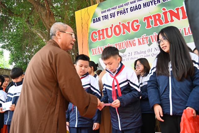 Thượng tọa Thích Tục Khang và các nhà hảo tâm trao quà cho các cháu học sinh nghèo vượt khó trên toàn huyện
