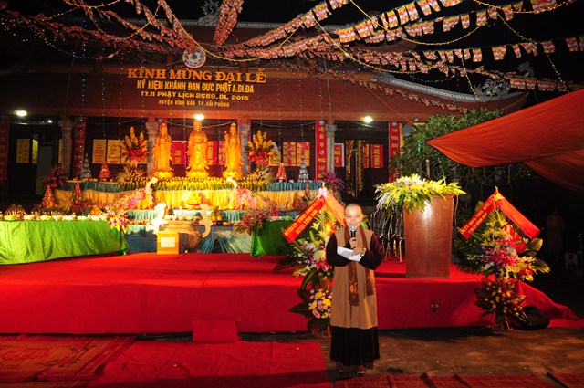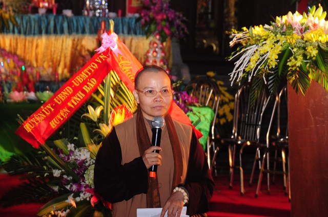 Tiếp đó, TT. Thích Thanh Giác – Trưởng BTS GHPGVN huyện Vĩnh Bảo đã lên cung tuyên lược sử Đức Phật A Di Đà và ý nghĩa của pháp môn tu niệm Phật. Thượng tọa đã nêu lên vai trò của đạo Phật đối với sự phát triển của đời sống, xã hội. Đức Phật ra đời nhằm mục đích để cứu khổ, ban vui cho chúng sinh. Đồng thời Thượng tọa cũng đã giới thiệu thế giới Cực Lạc cho toàn thể đạo tràng được hiểu một cách thấu đáo. Thế giới Cực Lạc là thế giới hoàn toàn thanh tịnh,mà ở đó không có khổ đau, khi được về đó rồi thì sẽ không còn sinh tử luân hồi nữa. Nếu chúng ta có được cái tâm thanh tịnh thì chúng ta cũng có thể xây dựng thế giới Cực Lạc ngay ở đời hiện tại. Sở dĩ chúng ta biết được thế giới Tây Phương Cực Lạc là do Đức Phật Thích Ca đã chỉ rõ trong kinh điển. Cũng nhờ Đức Phật Thích Ca mà chúng ta thấy được rằng trong quá khứ có Đức Phật hiệu là: A Di Đà. Đối với hành giả tu theo pháp môn Tịnh Độ thì phải luôn lấy Tín, Nguyện, Hành làm tư lương. Nếu có đầy đủ 3 yếu tố này thì sẽ được vãng sinh về Tây Phương Cực Lạc.