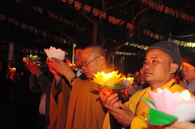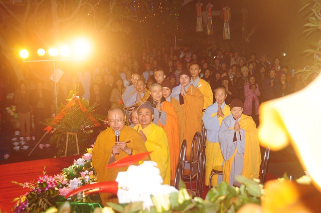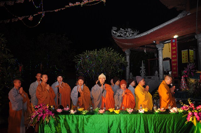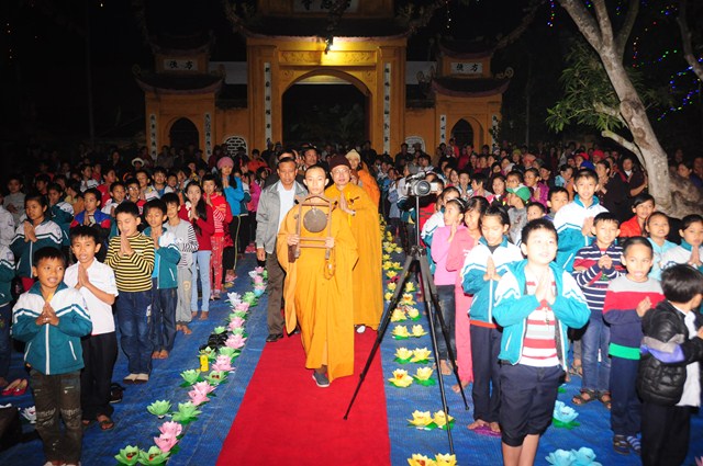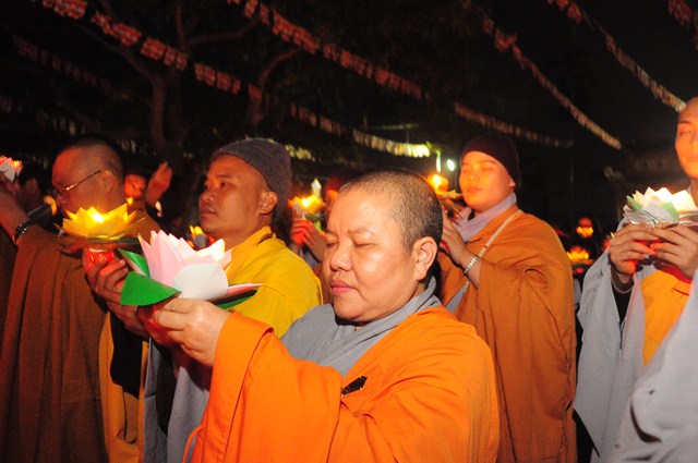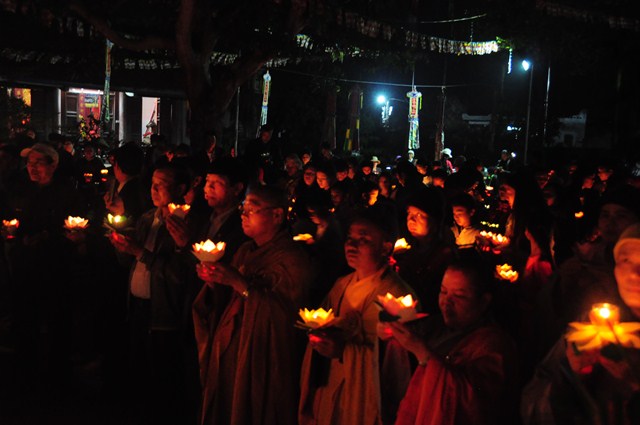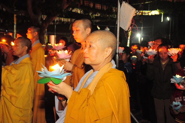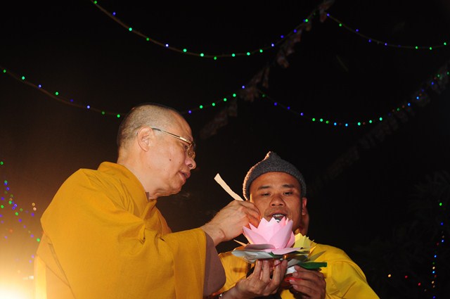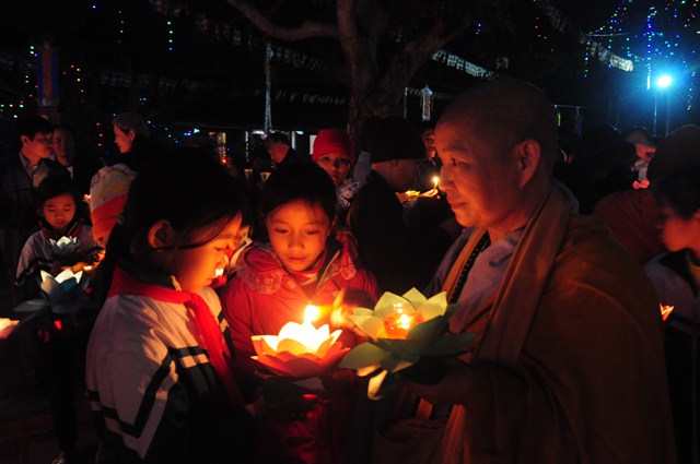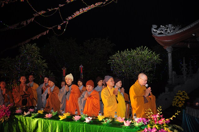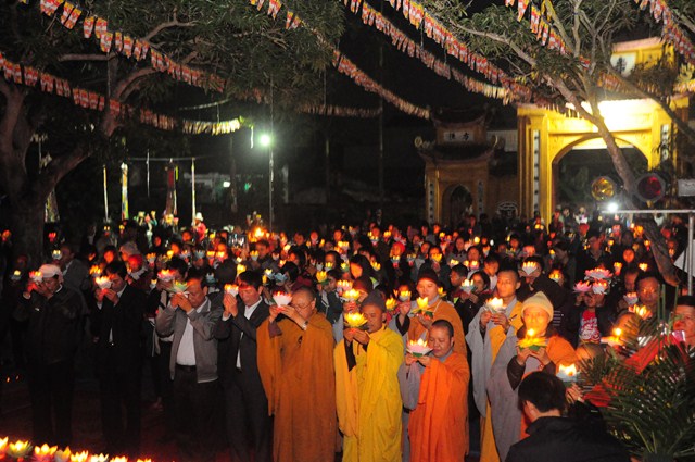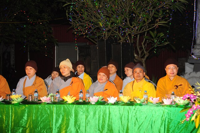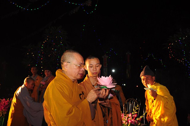 Giờ phút linh thiêng nhất của buổi lễ đã đến khi TT. Thích Thanh Giác xin ánh sáng từ bàn Phật rồi truyền sang cho chư tôn đức Tăng Ni, quý Phật tử, quý thiện nam, tín nữa. Ánh sáng của lòng Từ Bi và Trí tuệ dần dần được thắp sáng khắp sân chùa làm xua đi bao phiền muộn trong cuộc sống, phá tan màn vô minh, si sám chỉ còn lại đó là sự linh thiêng, huyển ảo của một đêm nến lung linh sắc màu kính dâng lên đức từ phụ A Di Đà nhân kỷ niệm ngày đản sinh của Ngài. Cầm ngọn nến trên tay, ai cũng thầm hứa với lòng mình sẽ cố gắng tu học, thực hành theo đúng pháp môn mà mình đã lựa chọn để khi xả bỏ báo thân này được sinh sang nước Tây Phương Cực Lạc – Nơi đó Đức Phật A Di Đà làm giáo chủ. Khi những ngọn nến được dâng lên, Chư tôn đức cùng quý quan khách, quý.