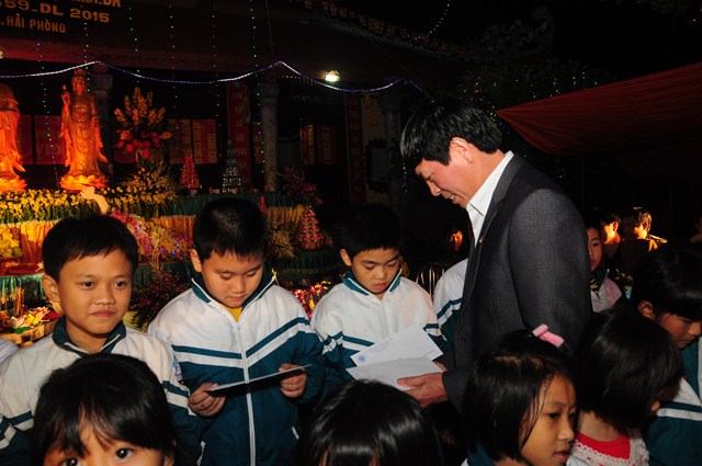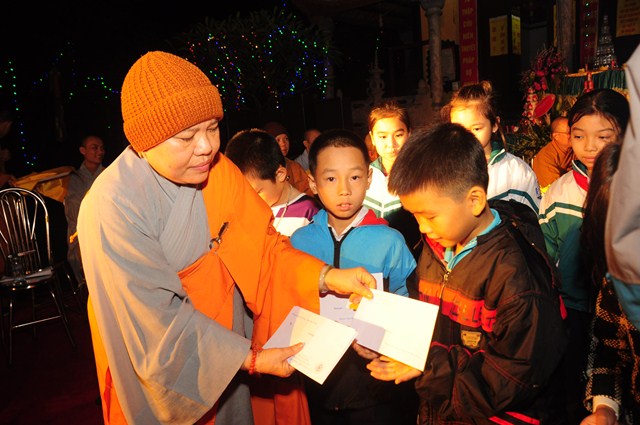 Nhân dịp này, thay mặt cho Ban trị sự GHPGVN huyện Vĩnh Bảo, TT. Thích Thanh Giác đã lên trao 1 phần quà là một chiếc máy vi tính trị giá 10 triệu đồng cho các em học sinh thuộc trường tiểu học thị trấn Vĩnh Bảo, 5 triệu đồng cho các học sinh bị chất độc màu da cam và trẻ mồ côi của huyện. Đồng thời, BTS GHPGVN huyện còn phối hợp ông Đinh Quang Ngọc – Cty điện lực TP.HCM, ông: Nguyễn Thọ Mùi, bà: Nguyễn Thị Thoa – Cty TNHH E29 trao 30 phần quà cho các gia đình chính sách, trẻ tàn tât, trẻ mồ côi, người già neo đơn hiện đang sinh sống tại TT Vĩnh Bảo với số tiền là 6 triệu đồng.