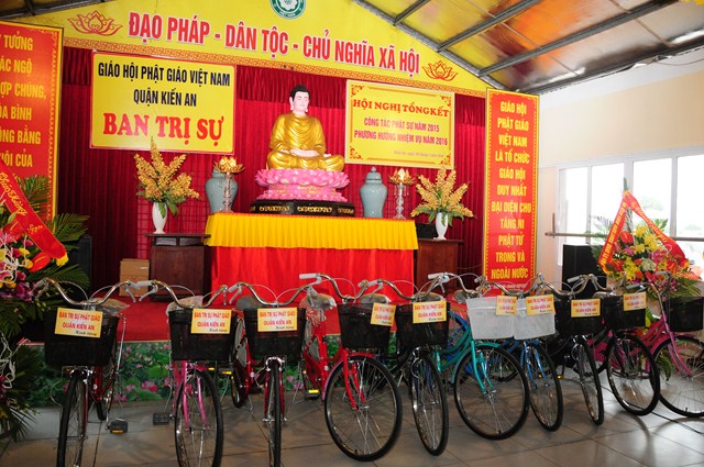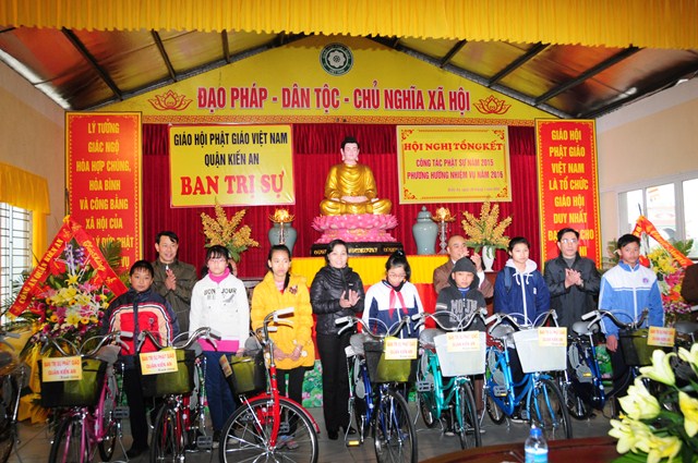 Nhân dịp này, BTS GHPGVN quận Kiến An đã trao 10 chiếc xe đạp cho 10 em học sinh nghèo vượt khó thuộc các phường trên địa bàn quận Kiến An với tổng giá trị là 12 triệu đồng. Thay mặt cho BTS GHPGVN quận Kiến An, Đại đức Thích Tục Nhân đã lên trao tặng cho các em phần quà đầy ý nghĩa này nhằm giúp các em vơi bớt những khó khăn trong cuộc sống, có phương tiện để đi lại trong quá trình học tập và sinh hoạt hàng ngày.