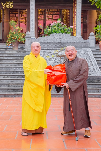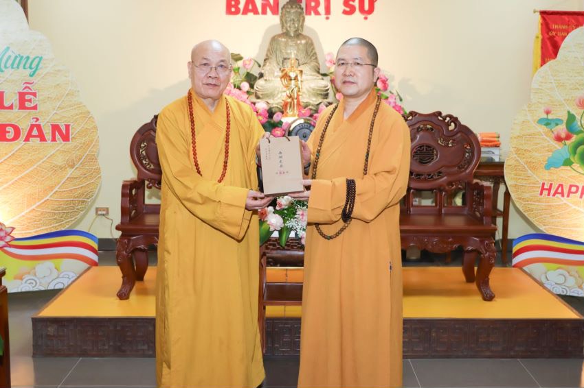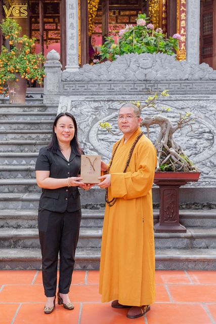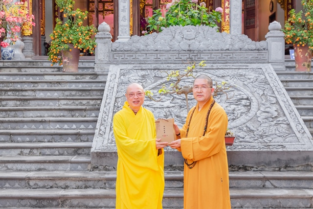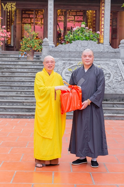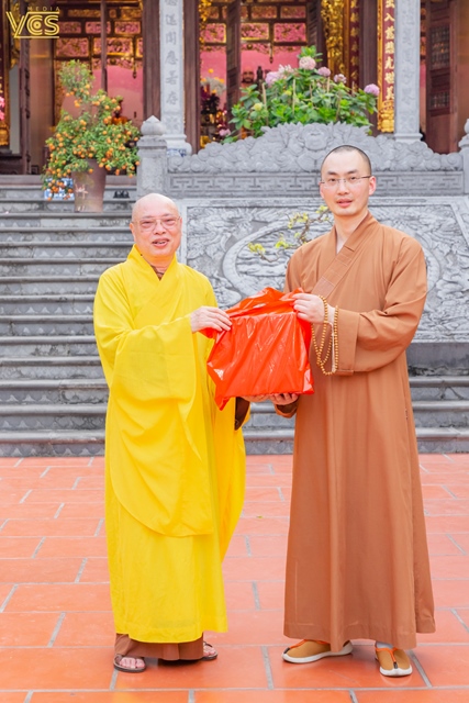 Phái đoàn tặng quà cho Hòa thượng Thích Thanh Giác – Trụ trì chùa Long Hoa