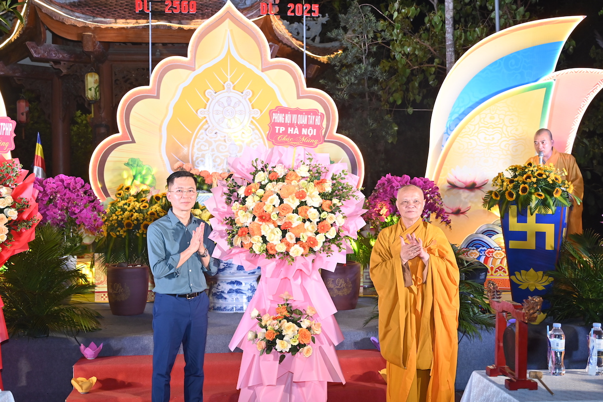 Thượng tọa Thích Tục Hạnh – Trưởng BTS GHPGVN huyện Kiến Thụy đón nhận lẵng hoa chúc mừng của Ban trị sự GHPGVN thành phố Hải Phòng