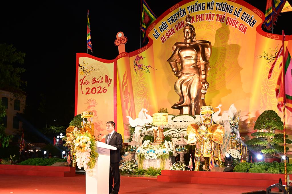 Ông Phạm Văn Tân, Chủ tịch UBND phường Lê Chân phát biểu khai mạc Lễ hội truyền thống Nữ tướng Lê Chân năm 2026