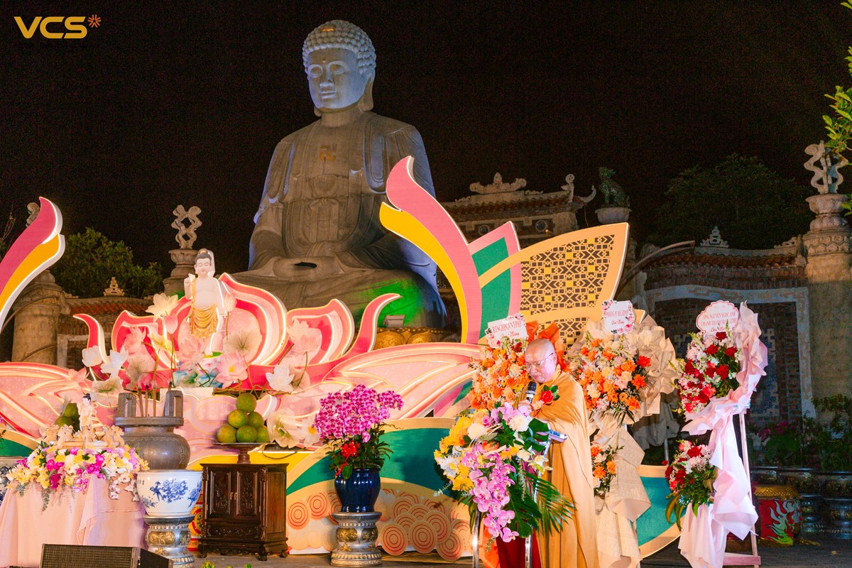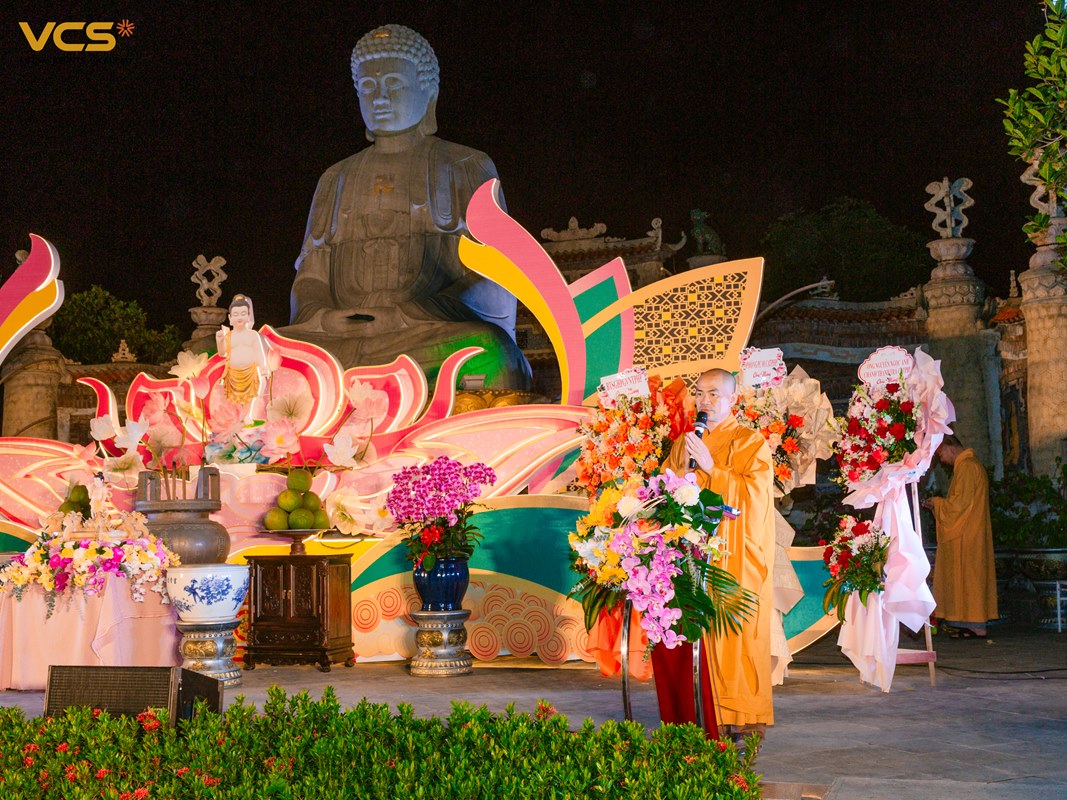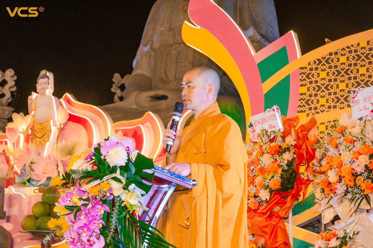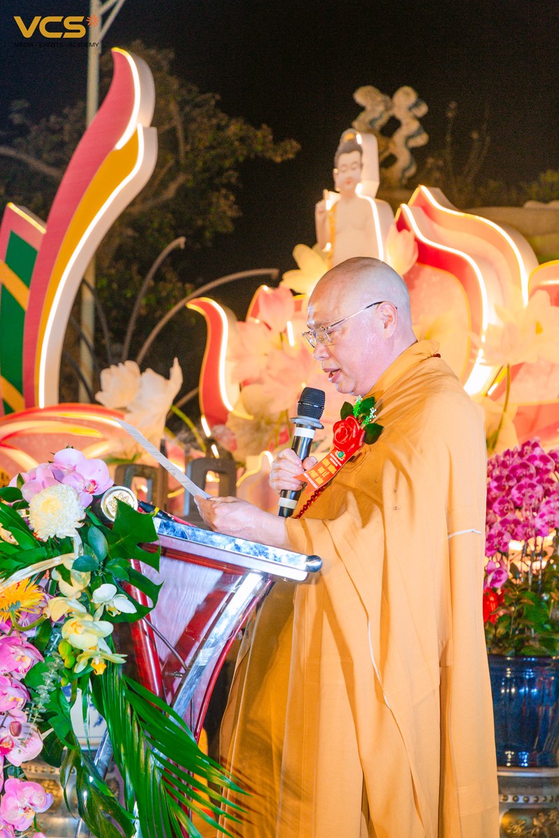 Tiếp đó, Đại đức Thích Quảng Nghĩa đã lên tuyên đọc Diễn văn Phật đản PL.2569 – DL.2025 của Đức Trưởng lão Hòa thượng Thích Thiện Nhơn – Chủ tịch HĐTS TƯ GHPGVN gửi chư Tôn đức Tăng Ni và Phật tử nhân dịp đại lễ Phật đản năm nay. Trong bài diễn văn, trưởng lão Hòa thượng Chủ tịch HĐTS kêu gọi cộng đồng Phật giáo toàn cầu hãy cùng nhau tinh tấn hành trì chánh pháp, nuôi dưỡng bình an nội tâm, lan tỏa năng lượng từ bi và trí tuệ, đóng góp thiết thực cho hòa bình và hạnh phúc chung của toàn nhân loại. Hòa thượng khẳng định Việt Nam là quốc gia có truyền thống Phật giáo từ lâu đời, gắn bó mật thiết với tiến trình xây dựng, phát triển đất nước, Việt Nam vinh dự được tổ chức Đại lễ Vesak 2025 trong không khí cả nước tưng bừng kỷ niệm đại thắng lịch sử mùa xuân năm 1975 thống nhất đất nước. Nhìn lại chặng đường lịch sử đó, Phật giáo Việt Nam tự hào đã góp phần vào chiến thắng hào hùng của dân tộc, góp phần làm nên bản lĩnh và trí tuệ Việt Nam với ngọn lửa trái tim bất diệt của Bồ tát Thích Quảng Đức và biết bao các thế hệ Tăng Ni, Phật tử đã dấn thân vì sự nghiệp giải phóng dân tộc. Chặng đường lịch sử hào hùng 50 năm qua cho chúng ta thấy rõ con đường phát triển mà dân tộc Việt Nam đang đi là con đường của sự đoàn kết, của sự bao dung và của một xã hội mà mỗi người đều được sống trong hòa bình, hạnh phúc và an lạc.