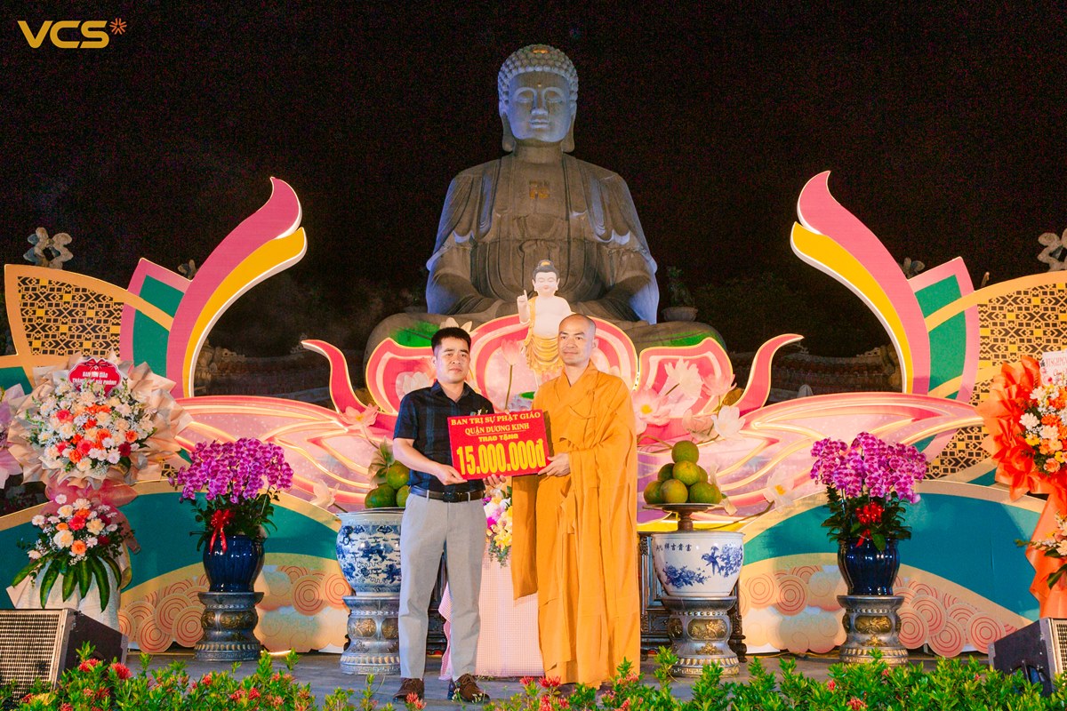 Dịp này, Ban Trị sự GHPGVN quận Dương Kinh đã trao số tiền 15 triệu đồng cho Hội Chữ thâp đỏ quận để hỗ trợ xây nhà cho gia đình có hoàn cảnh khó khăn trên địa bàn quận, phát huy tinh thần tương thân, tương ái, từ bi – cứu khổ – ban vui của đạo Phật trên phương châm: “Phật giáo luôn đồng hành cùng Dân tộc”, góp phần cùng chính quyền địa phương đảm bảo an sinh xã hội. Đây cũng chính là hành động thiết thực để cúng dàng lên Đức Từ phụ Bản sư Thích Ca Mâu Ni Phật nhân kỷ niệm ngày đản sinh.