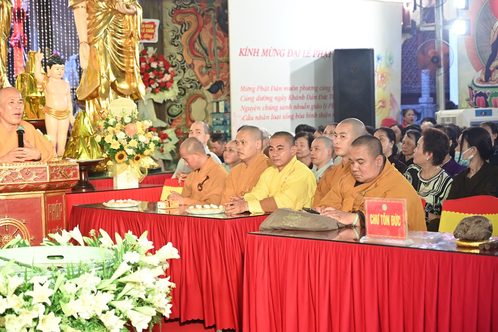 Sau nghi thức niệm Phật cầu gia bị, chào Quốc kỳ, Đạo kỳ, dành một phút tưởng niệm chư Thánh tử đạo, chư hương linh các anh hùng liệt sĩ, Đại đức Thích Bản Viên đã lên cung tuyên Thông điệp Phật đản PL.2569 – DL. 2025 của Đại lão Hòa thượng Thích Trí Quảng – Đức Đệ tứ Pháp chủ HĐCM TƯ GHPGVN gửi Tăng Ni, cư sĩ, đồng bào Phật tử ở trong, cũng như đang sinh sống tại nước ngoài. Toàn thể đại chúng đã trang nghiêm thành kính đón nghe bức thông điệp Phật đản đầy ý nghĩa chào mừng Đại lễ Phật đản Liên Hợp Quốc Vesak 2025 được tổ chức tại thành phố Hồ Chí Minh, Việt Nam. Thông điệp nhấn mạnh vai trò thiêng liêng của tinh thần đoàn kết và bao dung trong sự nghiệp kiến tạo hòa bình, hạnh phúc, và phát triển bền vững cho nhân loại.