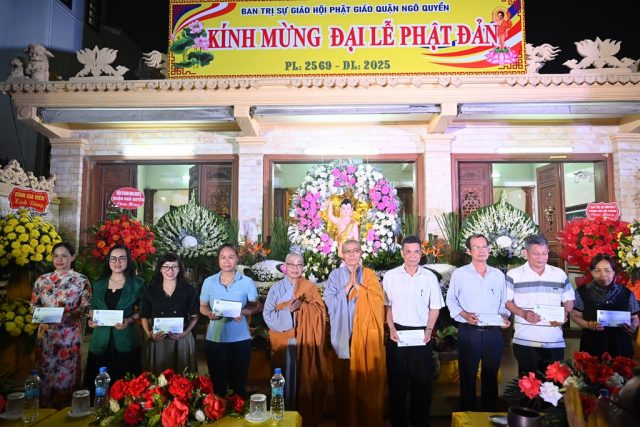 Trên tinh thần Từ bi – Cứu khổ – Ban vui, thực hiện phương châm của GHPGVN: “ Phật giáo luôn đồng hành cùng dân tộc”, nhân sự kiện Phật giáo trọng đại này, Ban trị sự GHPGVN quận Ngô Quyền đã trao 50 phần quà cho các gia đình có hoàn cảnh khó khăn đang học tập và sinh sống tại 8 phường trong quận, mỗi phần quà trị giá 500 nghìn đồng, với tổng số tiền là 25 triệu đồng, góp phần cùng chính quyền địa phương thực hiện tốt công tác an sinh xã hội trên địa bàn quận. Đây cũng chính là hoạt động thiết thực để cúng dàng lên đức Bản sư Thích Ca Mâu Ni Phật nhân kỷ niệm 2.649 năm ngày đản sinh của Ngài.