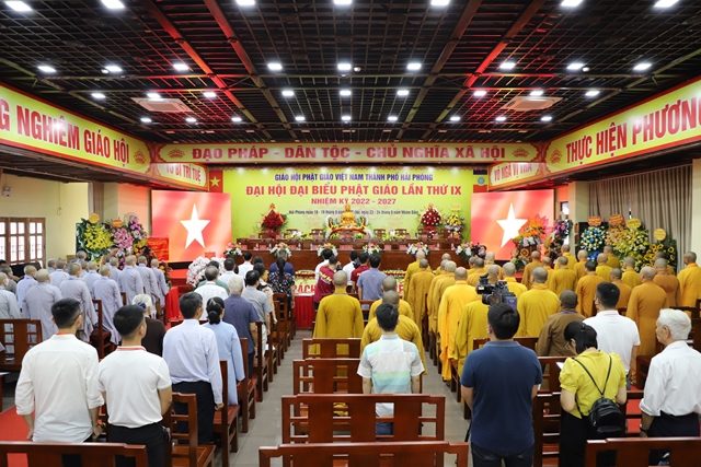 Trước đó, Ban Trị sự GHPGVN Tp. Hải Phòng đã thực hiện nghi thức niêm hương bạch Phật, cầu nguyện cho Đại hội Phật giáo Tp. Hải Phòng thành tựu viên mãn và đến đặt vòng hoa, dâng hương tưởng niệm tại nghĩa trang liệt sĩ Tp. Hải Phòng.