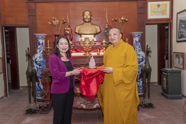 TT. Thích Quảng Minh – Trưởng BTS GHPGVN huyện Tiên Lãng tặng Phó Chủ tịch nước pho tượng Phật