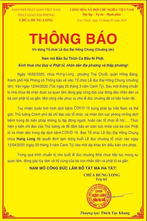 Theo Thượng toạ Thích Tục Khang – Uỷ viên Ban Phật giáo Quốc tế GHPGVN, Phó trưởng Ban trị sự GHPGVN thành phố Hải Phòng, trụ trì chùa Hưng Long, trưởng Ban tổ chức đại lễ đúc đại hồng chung chùa Hưng Long cho biết: “ Thực hiện ý kiến chỉ đạo của Thủ tướng Chính phủ, các cấp lãnh đạo thành phố Hải Phòng, cũng như của Ban tôn giáo thành phố và các cấp Giáo hội, nhằm đảm bảo an toàn sức khoẻ cho bà con Phật tử, nhân dân trong dịp dịch bệnh Covid – 19, Ban tổ chức chương trình tạm hoãn lễ đúc đại hồng chung và sẽ thông báo lại thời gian tổ chức cho quý Phật tử và nhân dân vào thời gian thích hợp, sau khi đại dịch Covid – 19 tại Việt Nam được khống chế hoàn toàn.”