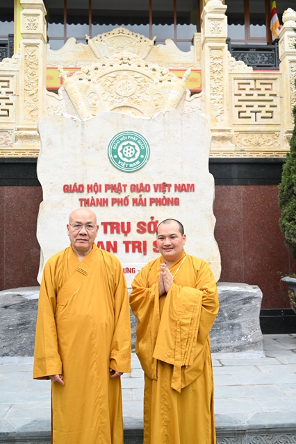 Tại trụ sở Ban trị sự GHPGVN thành phố Hải Phòng, đoàn đã tới thăm, lễ Phật, lễ Tổ và đỉnh lễ Hòa thượng trưởng Ban trị sự GHPGVN thành phố. Tại đây, Hòa thượng đã bố thí cho chư tôn đức Ban giám hiệu nhà trường và chư tôn đức Tăng ni sinh một thời pháp thoại ngắn chia sẻ về công lao của Chư Tổ tiền bối đã có công kiến thiết, xây dựng trụ sở Ban trị sự GHPGVN thành phố Hải Phòng từ thời sơ khai. Đặc biệt, phải kể đến công lao to lớn của cố Đại lão Hòa thượng Sa môn Thích Trí Hải – Người đã đặt nền móng vững chắc đầu tiên cho Phật giáo thành phố Hải Phòng và là người đã đặt viên gạch đầu tiên xây dựng trụ sở Ban trị sự GHPGVN thành phố. Hòa thượng đã nhắc lại công lao của Ngài và mong thế hệ chư tôn đức Tăng Ni hậu sinh sẽ tiếp bước, noi theo tấm gương của Ngài, duy trì mạng mạch Phật Pháp để Phật Pháp được mãi mãi trường tồn.