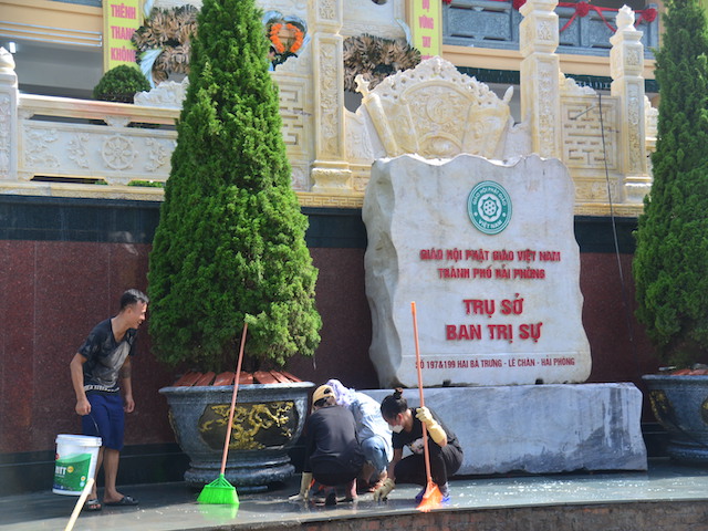 Các Phật tử lau dọn để chuẩn bị cho Đại lễ cắt băng khánh thành trụ sở Ban trị sự