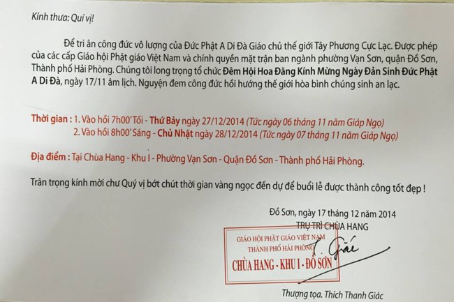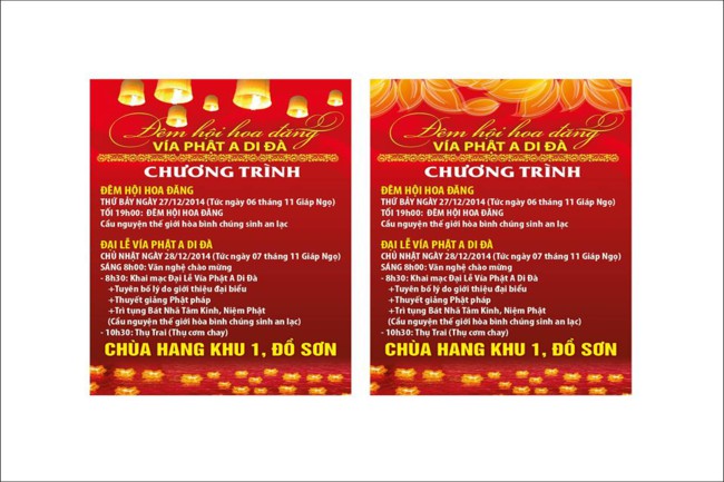 Nhằm kỷ niệm ngày khánh đản của đức Phật A Di Đà – bậc Thầy giáo chủ cõi Tây Phương Tịnh Độ, Chùa Hang, khu I, phường Vạn Sơn, quận Đồ Sơn, Tp. Hải Phòng sẽ long trọng tổ chức lễ vía Ngài vào 19 giờ ngày 27 tháng 12 năm 2014 ( nhằm ngày 6 tháng 11 năm Giáp Ngọ) với chương trình hoa đăng cầu nguyện thế giới hòa bình, chúng sinh an lạc, âm siêu, dương thái cùng chương trình văn nghệ kỷ niệm ngày Khánh đản của Ngài có sự tham gia của các ca sỹ đến từ TP. Hồ Chí Minh, thành phố Hà Nội: MC Nguyễn Tứ, Ca sỹ Hùng Thanh, ca sỹ Thu Hường ( X factor), ca sỹ Tâm Nguyện, Thúy Nga, Tuýnh Nhật Minh…