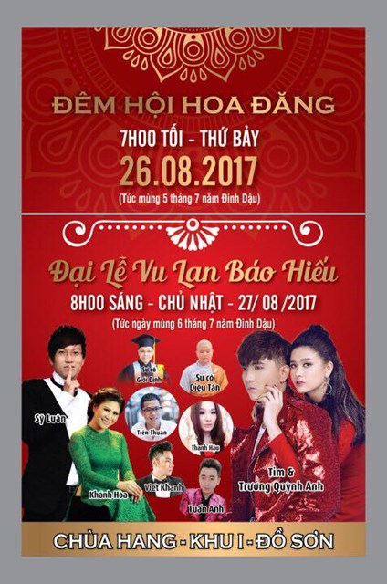 Được sự đồng ý của BTS GHPGVN Thành Phố Hải Phòng và Ban trị sự GHPGVN quận Đồ Sơn, chùa Hang ( Cốc tự), khu I, phường Vạn Sơn, quận Đồ Sơn, TP. Hải Phòng sẽ tổ chức Đêm nhạc Vu Lan – Báo Hiếu PL. 2561- DL. 2017 với sự tham dự của các văn, nghệ sỹ đến từ TP.HCM: Ca nhạc sĩ Sỹ Luân, Ca sỹ Tim & Trương Quỳnh Anh…Ca sỹ đến từ đoàn ca múa Hải Phòng: NSƯT Khánh Hòa, ca sỹ Viết Khanh, ca sỹ Thanh Hậu… và đêm hoa đăng tri ân cha mẹ, cầu nguyện thế giới hòa bình, chúng sinh an lạc, cầu nguyện cho anh linh các anh hùng liệt sỹ, chiến sỹ trận vong, đồng bào tử nạn trong các cuộc chiến tranh sớm được siêu sinh Cực Lạc vào hồi 19 giờ ngày 26/08/2017 ( nhằm ngày 05/7/Đinh Dậu).