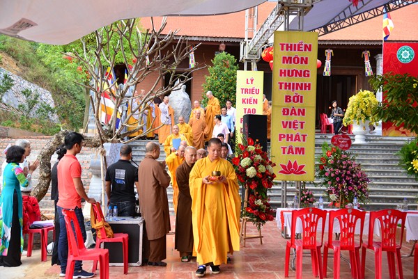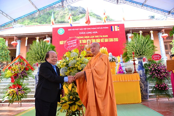 Thay mặt cho BTS GHPGVN thành phố Hải Phòng, TT. Thích Thanh Giác – Phó trưởng Ban thường trực BTS GHPGVN thành phố Hải Phòng đã lên cung tuyên Sơ Lược Tiểu sử Phật Hoàng Trần Nhân Tông. Trong phần cung tuyên tiểu sử có đoạn: Về Phật pháp, Ngài học đạo với Tuệ Trung Thượng Sĩ, được Thượng Sĩ hết lòng hướng dẫn và trao đổi những yếu nghĩa Thiền tông. Ngài tâm đắc nhất là câu: “Phản quan tự kỷ bổn phận sự, bất tùng tha đắc” (Quan sát lại chính mình đó là bổn phận, không do người khác làm được) và tôn thờ Tuệ Trung Thượng Sĩ làm Thầy. Ngài thường tới lui chùa Tư Phúc trong kinh thành để tụng kinh, tọa thiền, lễ bái Tam Bảo. Năm 1299. Ngài quyết tâm trở lại thăm Kinh sư lần cuối, rồi đi thẳng lên núi Yên Tử – Quảng Ninh quyết chí tu hành, tham thiền nhập định, lấy tên là “Hương Vân Đại Đầu Đà” và độ Đồng Kiên Cương làm đệ tử và ban pháp hiệu là Pháp Loa.” Qua đây cho chúng ta thấy rằng Đức vua Phật Hoàng Trần Nhân Tông là một người có công rất lớn đối với Phật giáo và dòng thiền Trúc Lâm.